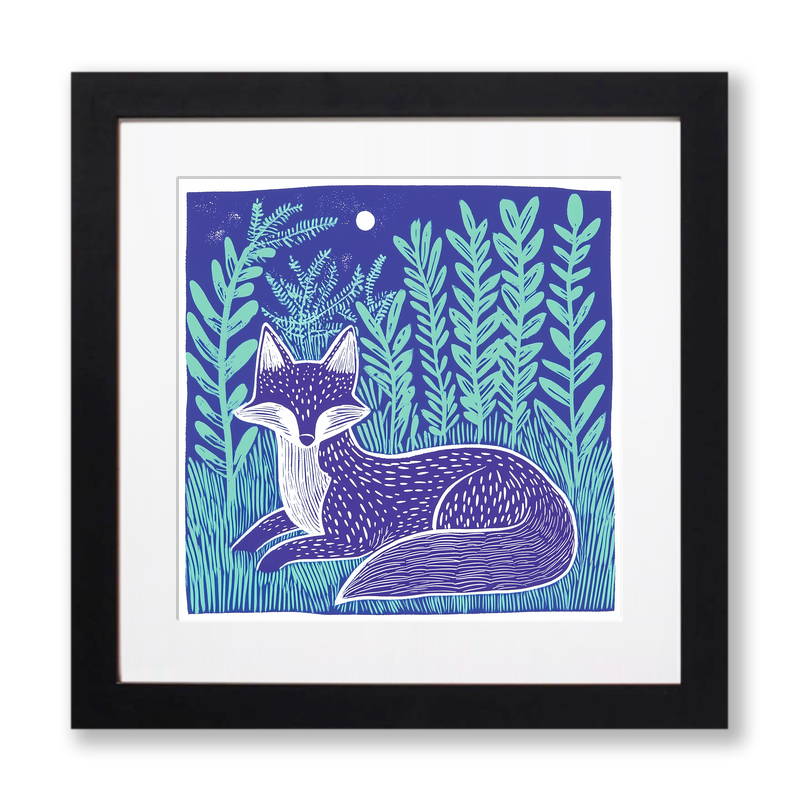 Invite the tranquillity of nature into your home with our beautiful Lino-print style artwork featuring a serene fox nestled amongst lush ferns. Part of our enchanting Nature & Wildlife collection, this captivating piece captures a restful fox in a rich tapestry of calming blue and vibrant mint green hues. The intricate design features delicate line work, emulating the traditional hand-carved techniques of linocut printing. Perfect for nature lovers, the artwork is available in two convenient sizes, 36cm and 46cm square, framed in your choice of classic black or timeless white. For those who love to create, we also offer a downloadable version including the original sketches and line drawings, allowing you to craft your own lino print. This artwork is a harmonious blend of artistry and nature, making it an ideal addition to any home setting.