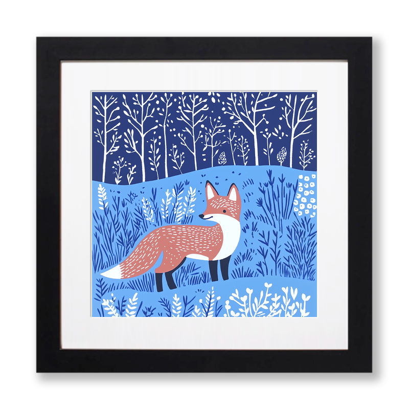Introducing our captivating lino-print style artwork, 'Fox in Woodland,' which is part of the Nature & Wildlife collection. This piece beautifully captures a serene fox standing amidst a lush woodland setting. The fox, depicted with intricate detailing, boasts a warm, russet coat with a striking white underbelly and black legs. Its expressive eyes gaze thoughtfully into the distance. The surrounding landscape is a harmonious blend of azure shades, intricately illustrated with an array of grasses and flora, lending a sense of depth and wonder to the scene. The backdrop is a striking deep blue, scattered with delicate white-barked trees and abstract foliage, creating a whimsical, dreamlike atmosphere. Available as a framed print in a choice of black or white frames, and in sizes of 36cm or 46cm square. For a truly hands-on experience, purchase and download the source images including line drawings and sketches to create your own lino print masterpiece.