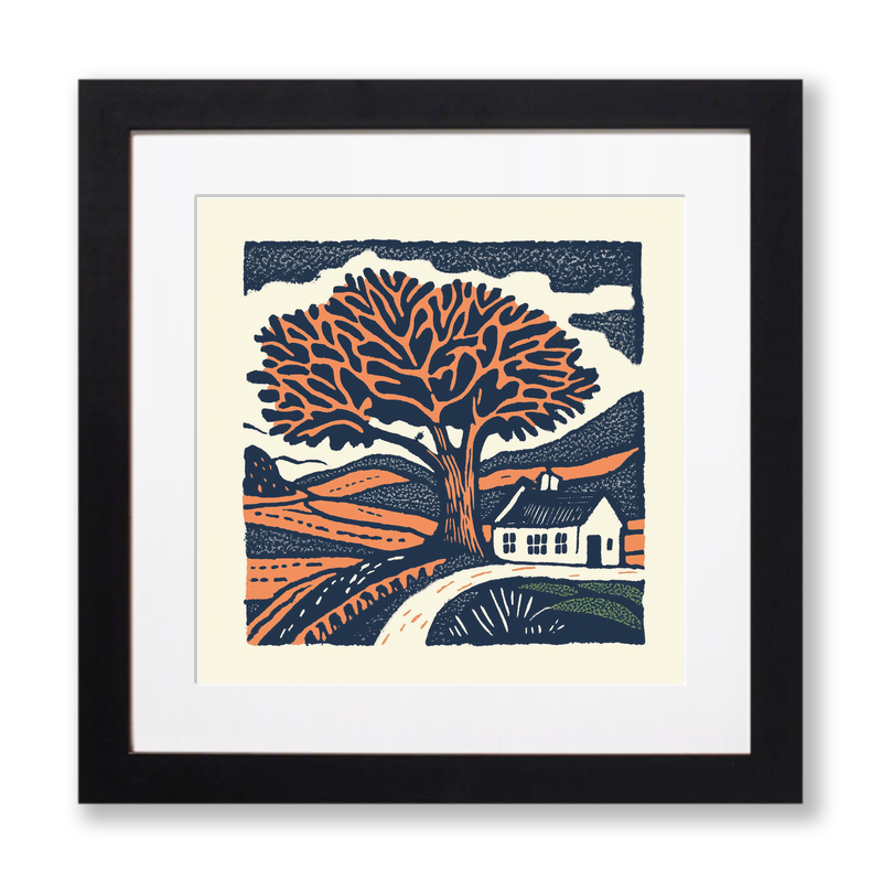 This striking lino-print style artwork captures the majestic allure of an oak tree standing proudly within a serene landscape. A charming white cottage nestles at the base of the towering tree, providing a perfect contrast to the intricate branches above. The scene is enriched with gently rolling hills and swirling clouds, all depicted in a harmonious blend of earthy tones. This piece, part of our Nature & Wildlife collection, evokes a sense of tranquillity, the great outdoors, and the peaceful coexistence of nature and rustic living. Available framed in black or white, and in two sizes—36cm or 46cm square—this print makes a sophisticated addition to any art lover's collection. For those wishing to embark on their own artistic journey, the downloadable source images are also available, including line drawings and sketches, allowing you to create your own lino prints.