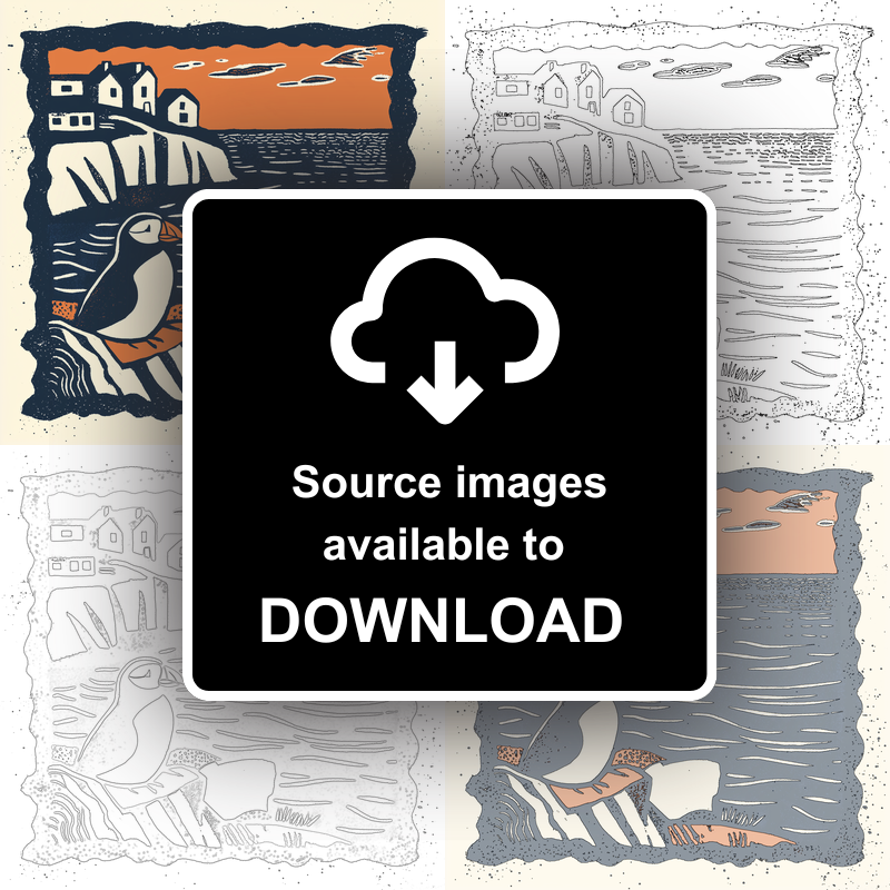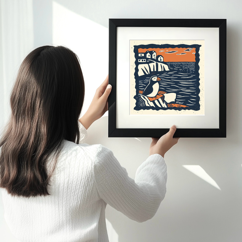 This lino-print style artwork beautifully captures a puffin perched on a rugged cliff edge, set against the serene backdrop of the ocean. The puffin, with its distinctive white belly and striking orange beak, is a focal point in this piece, exuding an air of calm confidence. The cliff's stark white contrasts with the deep blue of the ocean, where gentle waves add movement to the scene. Above, the sky is painted in a warm orange hue, dotted with stylised clouds, providing a dramatic contrast to the cool colours below. In the background, quaint white houses sit atop the cliff, hinting at a small coastal community. This artwork is part of our Nature & Wildlife collection, celebrating the beauty of maritime landscapes and wildlife. Framed in either black or white, it is available in two sizes: 36cm or 46cm square. For those creatively inclined, you can also purchase the source images to create your own lino prints.