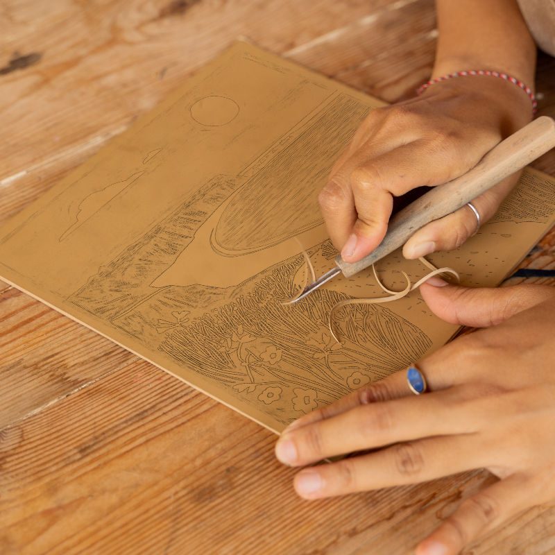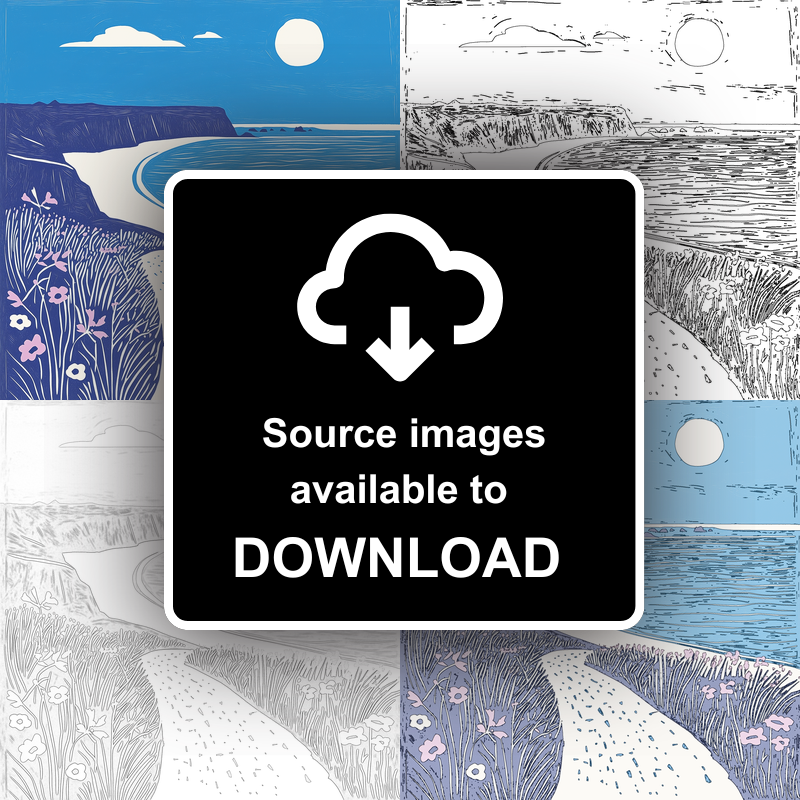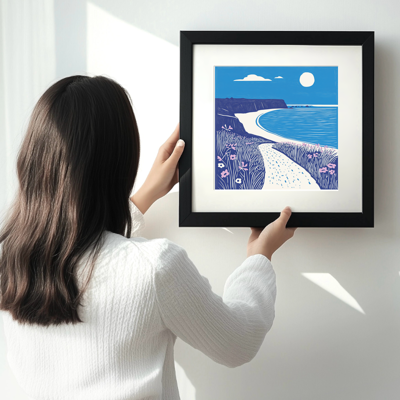 Immerse yourself in the tranquillity of Beer Beach, Devon, with this stunning lino-print style artwork. Part of our 'UK Picturesque Harbours and Beaches' collection, this piece captures the serene beauty of the Devon coastline at sunrise. The foreground features a winding path adorned with delicate wildflowers, leading your gaze towards the expansive beach and gentle waves. The cliffs frame the azure sea, creating a harmonious balance between land and water. With its bold, simplistic lines and vibrant colour palette, this artwork beautifully conveys the peaceful essence of coastal life. Available in a choice of black or white frames and in sizes 36cm or 46cm square, it complements any interior setting. For those inspired to create their own art, purchase the downloadable source images including intricate line drawings and sketches. Embrace the charm and simplicity of traditional lino-print design in your very own space.