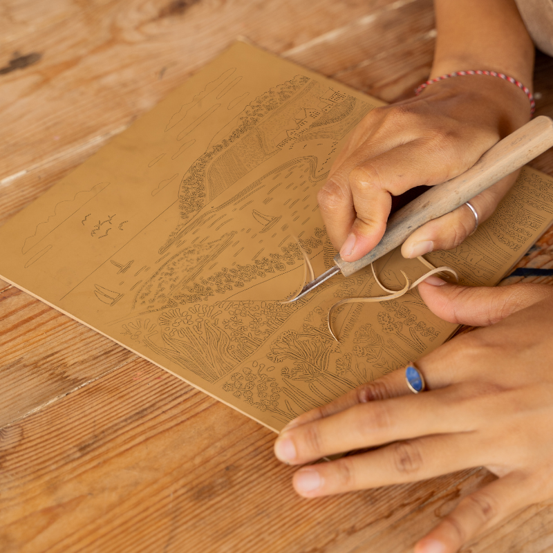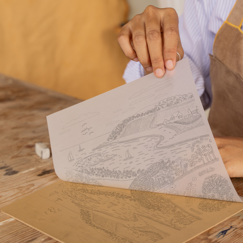 Capture the serene beauty of Bigbury-on-Sea and Burgh Island with this exquisite lino-print style artwork. Part of our UK Picturesque Harbours and Beaches collection, this piece perfectly encapsulates the idyllic landscape of Devon's coastline. The scene is dominated by the azure tides gently caressing the sandy shoreline, with elegant sailboats dotting the clear blue waters. Lush, rolling hills, depicted in rich greens and blues, embrace a quaint cluster of seaside cottages, illustrated with intricate detail. Wildflowers are artfully scattered across the vibrant foreground, while flocks of birds soar beneath a sky brushed with soft, fluffy clouds. Available framed in black or white and in sizes of 36cm or 46cm square, it's a stunning addition to any space. Explore creativity further with our unique option to download the source images, line drawings, and sketches, making it perfect for those interested in crafting their own lino print.