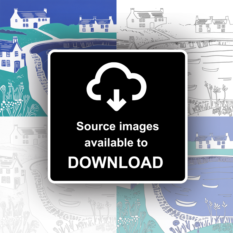Capture the serene beauty of Crail Harbour, Fife with this stunning lino-print style artwork from our UK Picturesque Harbours and Beaches collection. This print exquisitely highlights the quaint charm of a Scottish harbour town with its blue and teal palette. The artwork features iconic white-washed cottages with their unmistakable, simple architectural lines. Small boats rest peacefully on the serene waters of the harbour, which is elegantly depicted in sweeping curves. Surrounding the harbour, meandering paths lead past vibrant fields, offering a glimpse of nature in delicate white floral motifs. Available in two sizes, 36cm or 46cm square, each print is lovingly framed in your choice of black or white, bringing this tranquil scene into your home. Additionally, art enthusiasts can purchase downloadable source images, including line drawings and sketches, to craft their own unique lino prints. This artwork is a perfect blend of simplicity and elegance, adding a touch of coastal charm to any space.