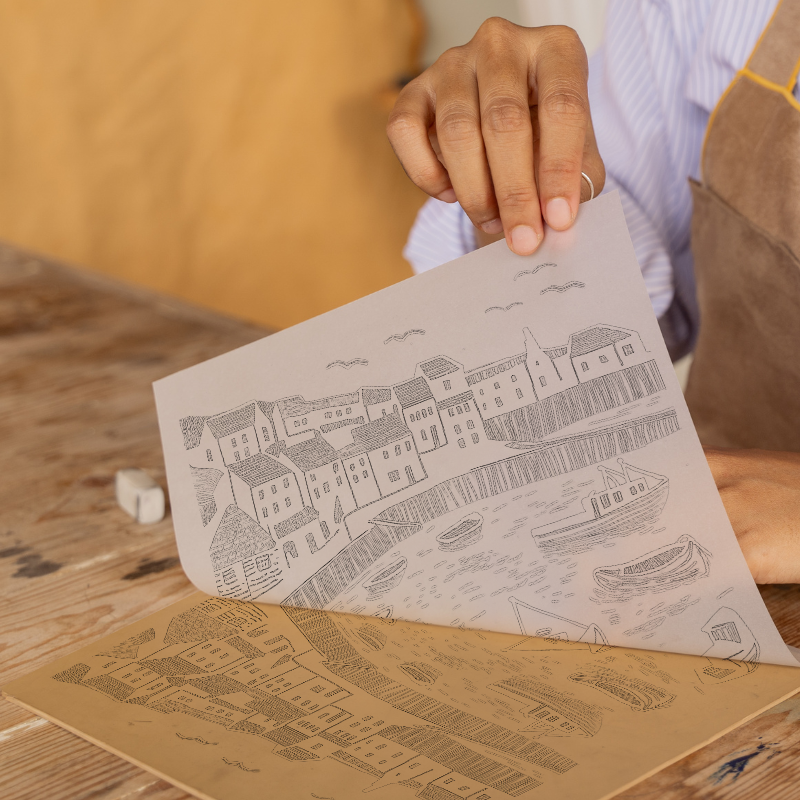 This vibrant lino-print style artwork captures the serene beauty of Looe Harbour, located in the picturesque landscape of Cornwall. The piece showcases the harbour's iconic features with a blend of intricate line work and bold shapes. Whitewashed buildings line the harbour, their rooftops a striking contrast against the crisp, cerulean blue sky. Seagulls soar above, adding a touch of life to the tranquil scene. In the calm waters of the harbour, fishing boats are moored, subtly detailed to evoke a sense of movement. This artistic interpretation of Looe Harbour, part of our UK Picturesque Harbours and Beaches collection, is available framed in black or white, in sizes of 36cm or 46cm square. Additionally, for the creatively inclined, source images, including line drawings and sketches, are available for download, allowing you to craft your own lino print inspired by this delightful scene.
