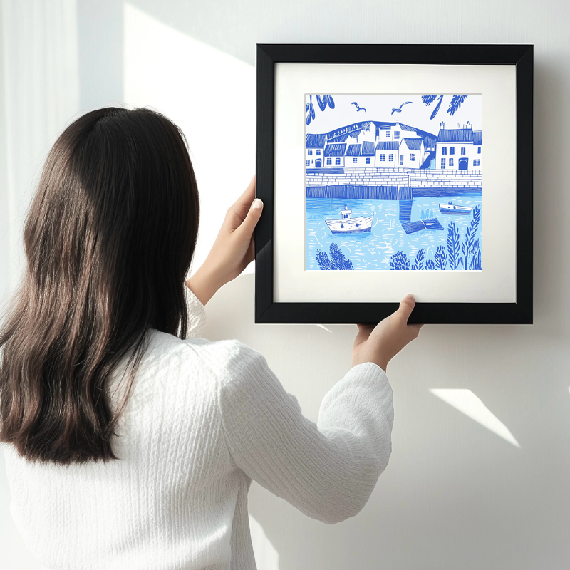 Capture the serene beauty of Padstow Harbour, Cornwall, with this exquisite lino-print styled artwork. This piece, part of our 'UK Picturesque Harbours and Beaches' collection, depicts the charming harbour lined with traditional whitewashed houses, quaintly overspread by distant rolling hills. The artwork beautifully contrasts the vibrant blue shades of the sky and sea against the crisp white outlines of the buildings. Detailed touches of boats gently resting in the harbour and seagulls gracefully soaring overhead add life to this tranquil seaside scene. Framed in either black or white, and available in two sizes, this print offers a unique touch of Cornwall to any space. Dive deeper into creativity by downloading the original artwork, sketches, and line drawings to craft your own lino print and personalise your art experience.