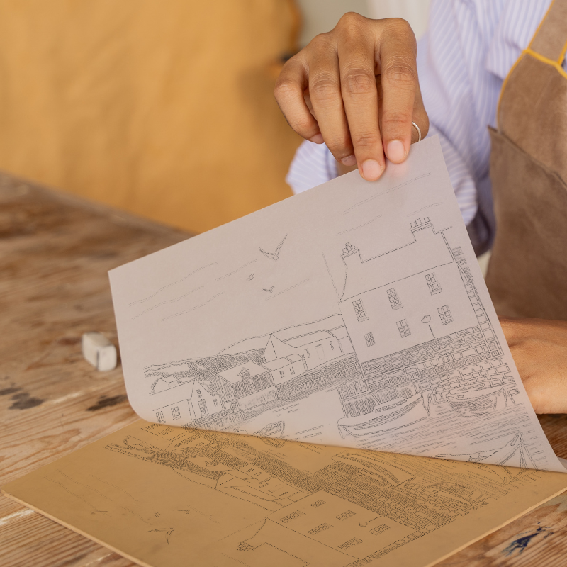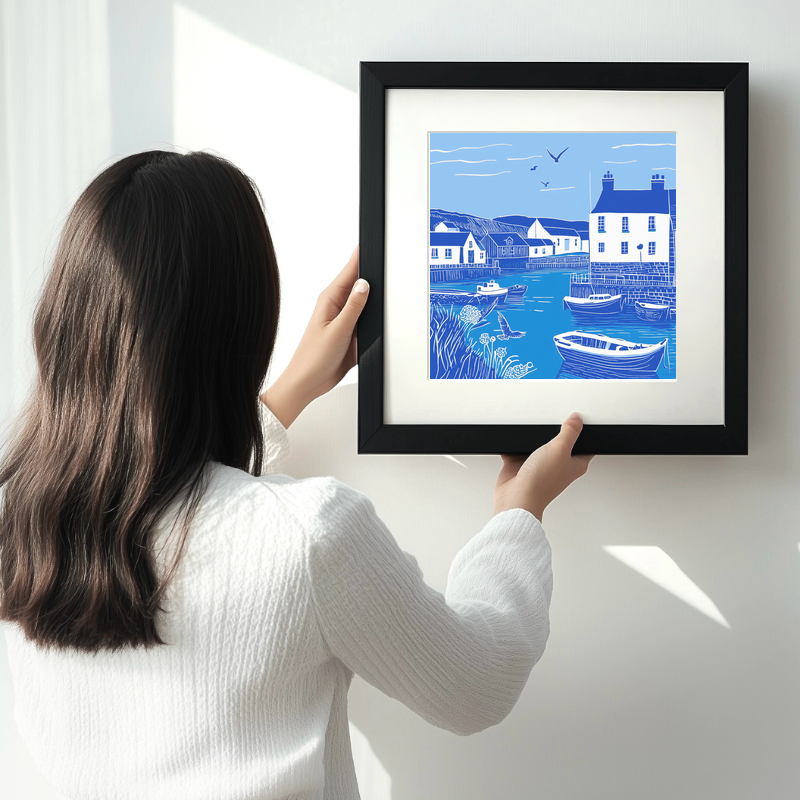Immerse yourself in the serene beauty of Padstow Harbour, Cornwall, with this captivating lino-print style artwork, part of our 'UK Picturesque Harbours and Beaches' collection. The piece beautifully captures the tranquil essence of this iconic harbour scene, using a harmonious palette of blues and whites. The artwork features a charming array of boats gently bobbing on the calm water, lined by traditional harbour buildings. The backdrop of rolling hills adds to the picturesque landscape, while seagulls glide gracefully above, adding life to the sky. The intricate line work and rich textures emphasize the movement of water and the rustic charm of the harbour architecture. Available in 36cm or 46cm squares, framed in either black or white, this print is an ideal addition to any home or office. Additionally, explore your own creativity with our unique option to purchase and download the source images, including line drawings and sketches, to create your own lino prints.