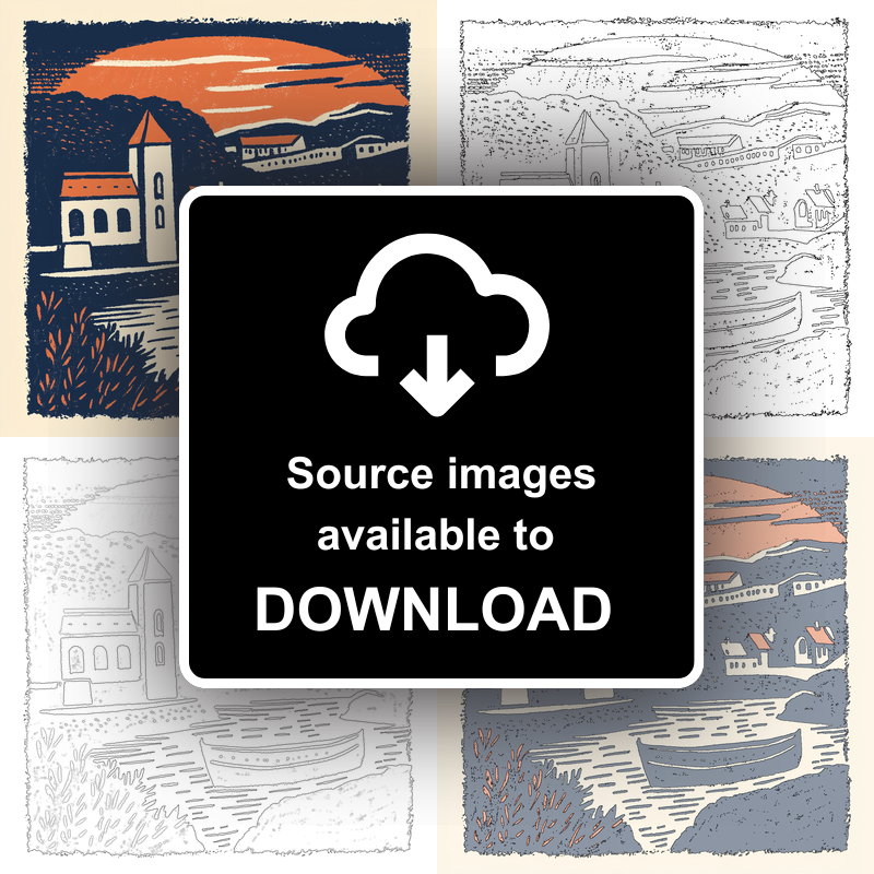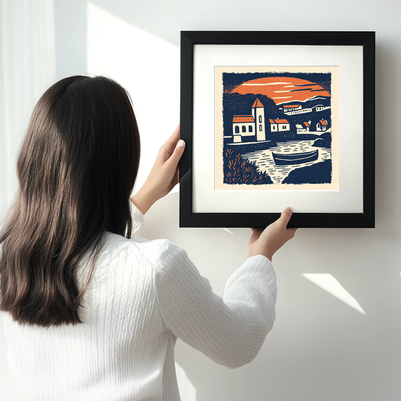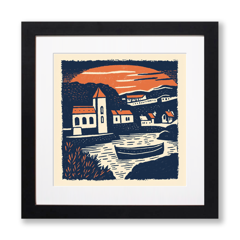 Experience the timeless charm of Durham Cathedral with this stunning lino-print style artwork, part of our exclusive Architecture & Cityscapes collection. The piece captures the scenic beauty of the cathedral nestled among quaint buildings, with a gently flowing river in the foreground and a radiant sun setting behind lush hills. Crafted with meticulous detail, the artwork features bold outlines and a harmonious blend of navy blue and warm orange against a cream background, evoking a sense of both nostalgia and serenity. Available framed in elegant black or white, this print comes in two sizes, 36cm or 46cm square, perfect for enhancing your living space. For those inspired by artistry, we offer a unique opportunity to purchase and download the source images, including line drawings and sketches, to create your own lino prints at home. Whether you're an art enthusiast or simply love iconic landmarks, this piece will make a beautiful addition to any collection.