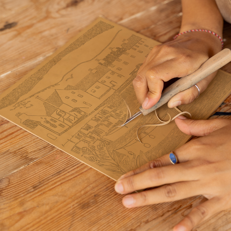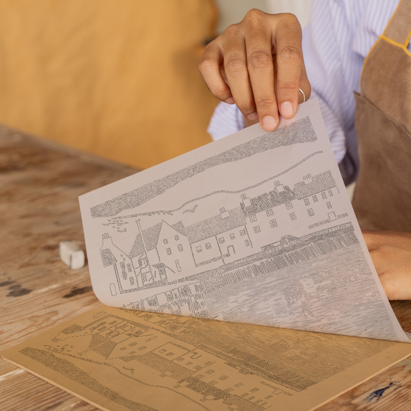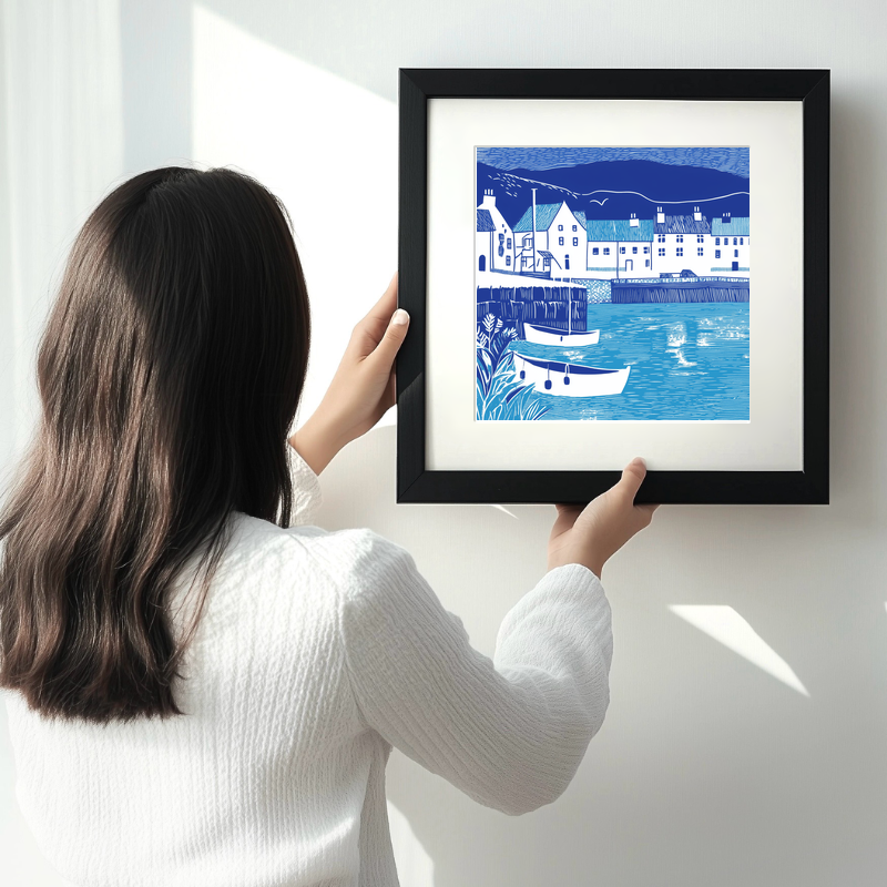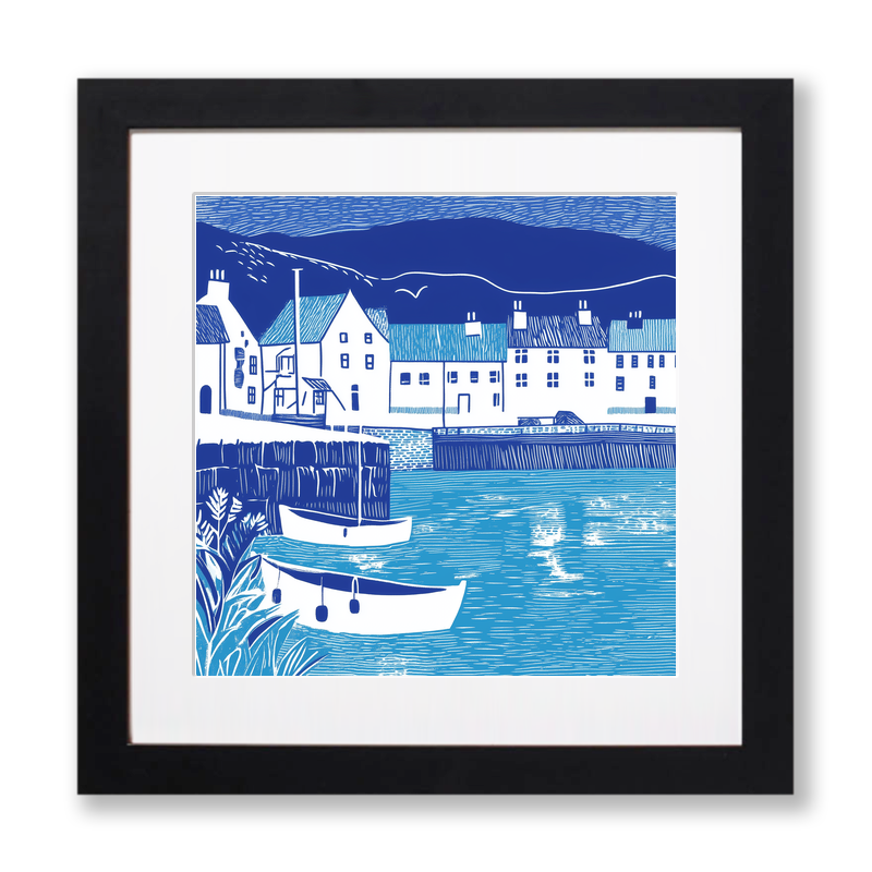 Immerse yourself in the serene beauty of Portree Harbour, Isle of Skye, with our exquisite lino-print style artwork. Capturing the essence of the picturesque harbour, this piece features quaint white-fronted houses meticulously designed with elegant linework. The tranquil waters are depicted with a calming blue hue, reflecting the soft outlines of moored boats. Gentle lines suggest movement in the water, breathing life into the scene. Lush foliage in the foreground adds to the composition, offering a sense of depth and vibrancy. Available in a sleek black or white frame, this artwork comes in two sizes: 36cm or 46cm square, perfect for any space. For those inspired by the creative process, purchase the downloadable source images, including the artist’s line drawings and sketches, to craft your own lino-print masterpiece. Part of our UK Picturesque Harbours and Beaches collection, this piece is a perfect homage to the timeless charm of the Scottish coast. An ideal addition to any home or creative studio.