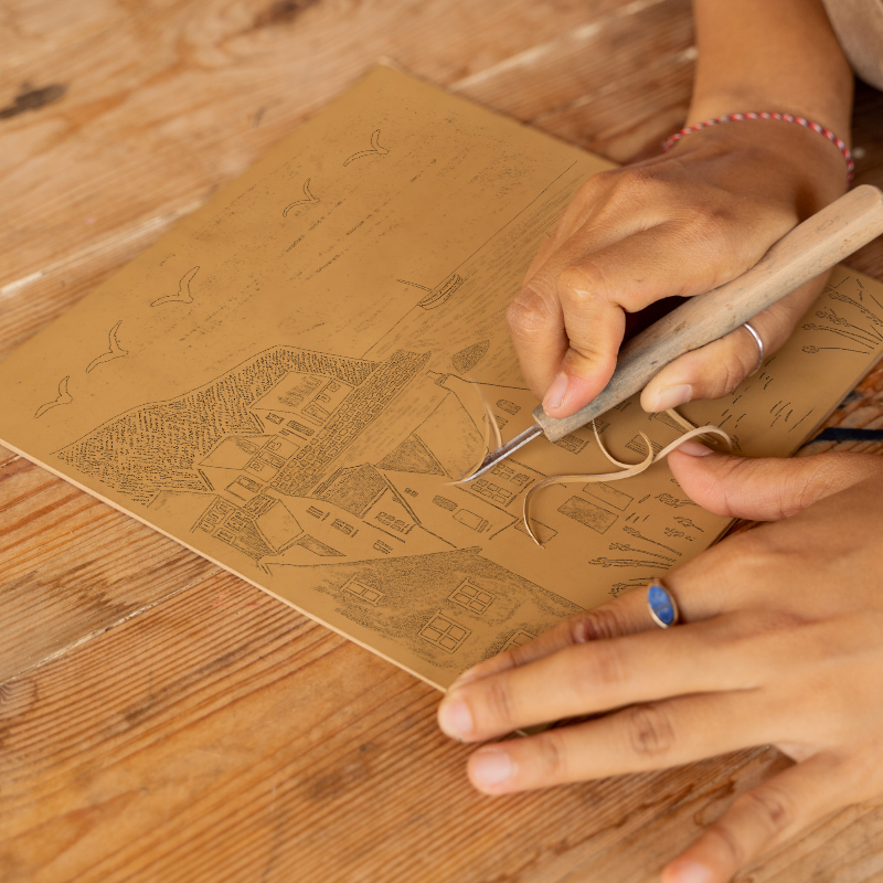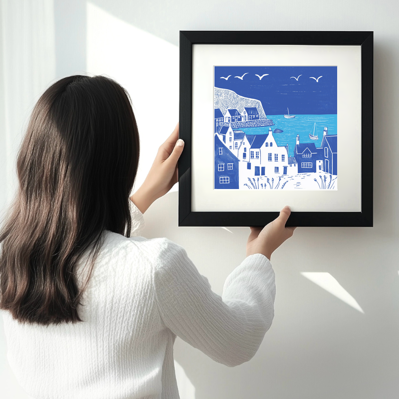 This striking lino-print style artwork captures the charming coastal village of Staithes, North Yorkshire in a minimalist yet captivating blue and white palette. Part of our exclusive UK Picturesque Harbours and Beaches collection, this piece beautifully illustrates the quaint, sloping rooftops and iconic cottages of Staithes nestled by the sea. The houses are depicted in bold, clean lines against a vibrant azure background, reminiscent of a breezy seaside day. Seagulls gracefully soar through the deep blue sky, while fishing boats gently float on the serene turquoise waters, creating a sense of tranquillity and timelessness. This piece is available framed in elegant black or white options and can be purchased in sizes of 36cm or 46cm square. Additionally, for an interactive experience, you can download the source images, including line drawings and sketches, to craft your own lino prints at home.