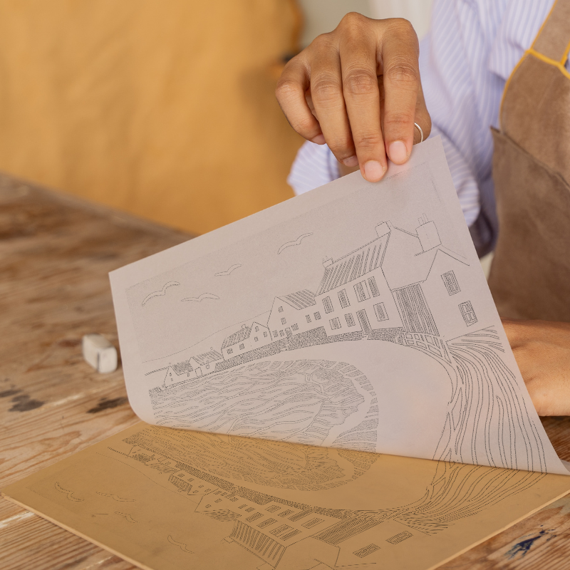 Capture the serene beauty of West Bay, Dorset, with this stunning lino-print style artwork. Featuring a picturesque harbour scene, the image portrays charming coastal cottages lining the sweeping curve of the bay. The vibrant blue waves gently lap against a white shore, while seagulls soar above, adding a dynamic sense of movement. The simplistic yet striking design highlights the rustic charm and idyllic scenery of West Bay, making it a perfect addition to any home. Available in elegant black or white frames, this piece can be purchased in two sizes, 36cm or 46cm square. Moreover, unleash your creativity with our unique offering to download the source images, including line drawings and sketches, for your own lino print adventure. Part of our 'UK Picturesque Harbours and Beaches' collection, this artwork will transport you to the tranquil shores of Dorset.