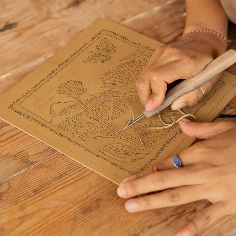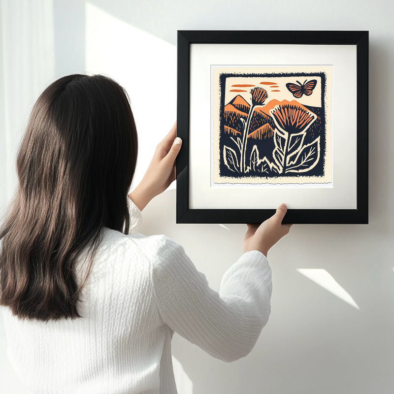 Discover this captivating lino-print style artwork from our Nature & Wildlife collection, featuring a thistle with a butterfly. The piece showcases a stunning contrast of bold, earthy colours, encapsulating the serene essence of the natural world. The thistle, standing tall with intricate leaves, captures the eye with its detailed blossoms. Above, a butterfly gracefully flutters amidst the scene, adding an element of delicate movement. In the background, gentle rolling hills stretch under a clear sky, adding depth and tranquillity to the composition. Available in both black and white frames, and in sizes of 36cm or 46cm square, this artwork fits seamlessly into any space, bringing a touch of nature's beauty indoors. For those with a creative spirit, we offer an exclusive option to download the source images, including line drawings and sketches, enabling you to craft your own unique lino prints. Embrace the artistry of nature with this charming piece.