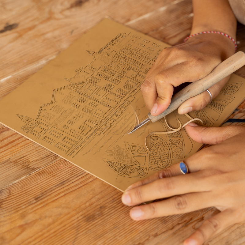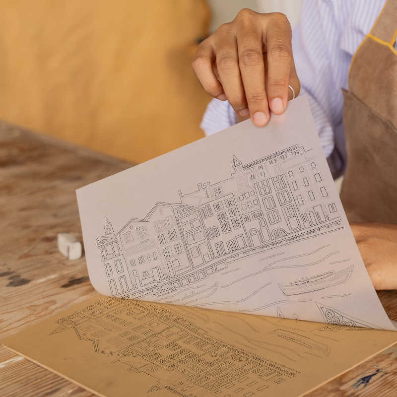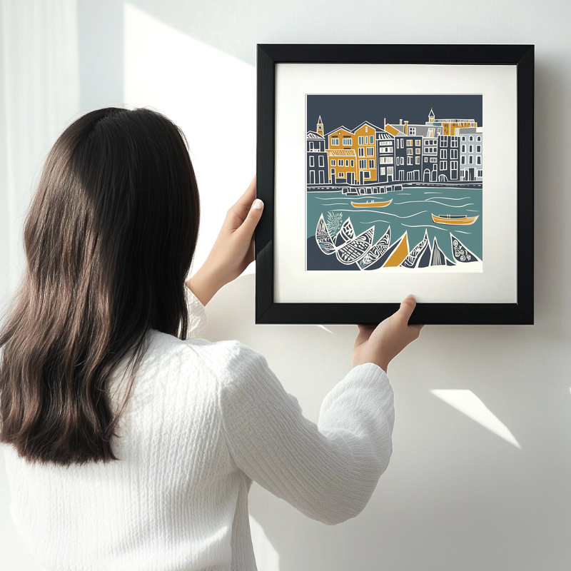 Explore the timeless allure of the Venice Grand Canal with this stunning lino-print style artwork from our Architecture & Cityscapes collection. This captivating piece captures the essence of Venetian charm, with distinctive facades of the historic buildings lining the canal. The artwork showcases a harmonious palette of deep navy and gold, interspersed with elegant hints of teal and soft grey, creating a sophisticated and serene scene. The bold, clean lines reflect the architectural grandeur of Venice, while the water gently carries the iconic gondolas with an artistic flair. Choose between a sleek black or white frame, available in 36cm or 46cm square sizes, to complement your décor. Additionally, unleash your creativity with our unique offering—purchase and download the source images, including detailed line drawings and sketches, allowing you to craft your own lino print rendition at home. This artwork is more than a piece of décor; it's an invitation to partake in the beauty and craftsmanship of Venice.