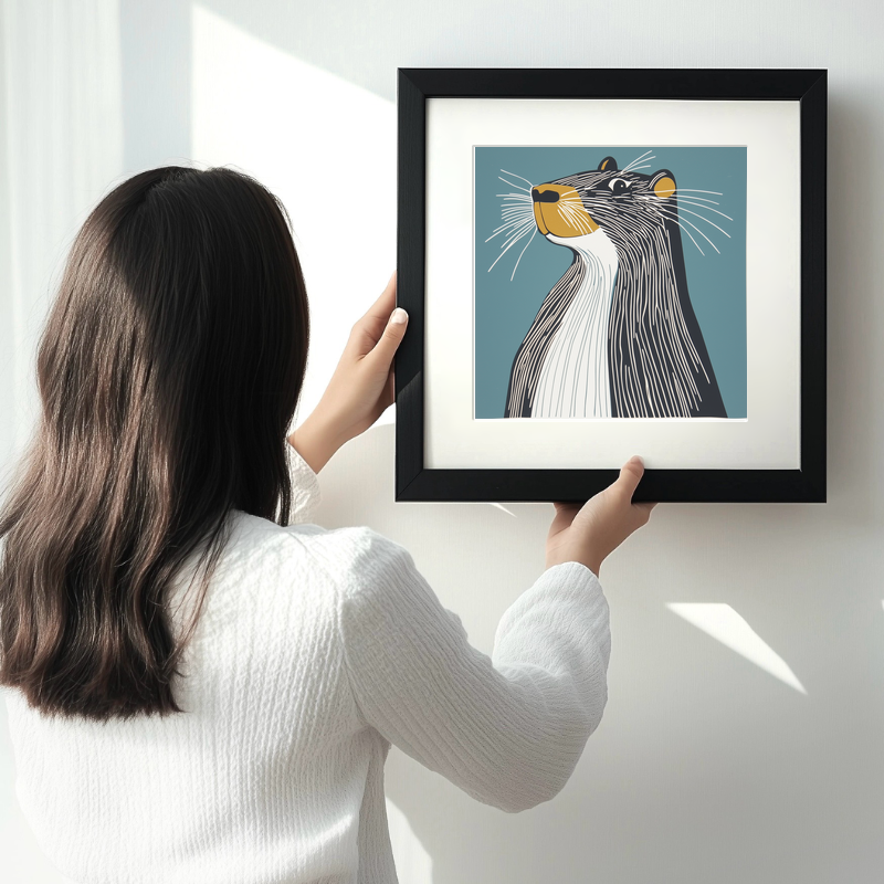 Delight your senses with our charming lino-print style artwork featuring the adorable capybara from our Cute Animals collection. This piece captures the capybara with a whimsical flair, highlighting its gentle features and endearing smile. Its sleek black and white lines accentuate the unique details of the artwork, while a soothing blue background provides a delightful contrast, adding a serene touch to any room. The composition uses dynamic lines to create movement, bringing the capybara to life. Perfectly framed in your choice of a black or white frame, this artwork is available in 36cm or 46cm square sizes, ready to enhance the aesthetic of your space. We also offer a unique digital option; purchase and download the artwork's source images, complete with line drawings and sketches, and enjoy creating your own lino print masterpiece. Ideal for animal lovers and art enthusiasts alike, this piece is sure to warm hearts and inspire creativity.