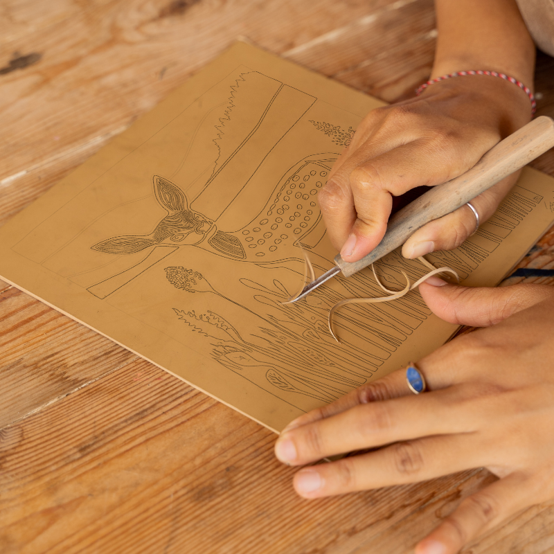 This enchanting lino-print-style artwork captures the delicate elegance of a fawn amid a serene landscape. The central focus is a doe-eyed baby deer, expertly rendered in bold black and white lines that highlight its gentle features and spotted coat. The fawn is surrounded by tall, stylised grasses and delicate wildflowers, presented in warm ochre tones that add depth and character to the piece. Above, soft blue-grey undulating hills and a silhouette of trees create a calm and dreamy backdrop, which enhances the peaceful ambiance of the scene. Offered as part of our 'Cute Animals' collection, this piece is a beautiful homage to the grace of nature and will bring a touch of the wild into any space. The high-quality print is available framed in either black or white, complementing the striking contrast of the artwork. For those who love crafting their own creations, the downloadable source images including line drawings and sketches are perfect for making your own lino prints.