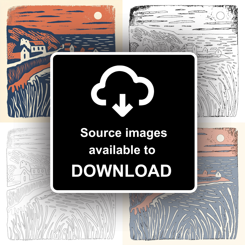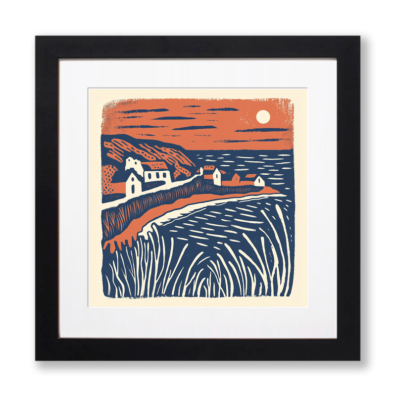 Experience the serene beauty of Bigbury-on-Sea and Burgh Island with our unique lino-print style artwork. This piece captures the picturesque charm of Devon’s iconic coastline, featuring a tranquil seascape and charming architecture bathed in the soft hues of a setting sun. Expertly framed in your choice of black or white, and available in either 36cm or 46cm squares, this artwork is a perfect addition to any home or office. Additionally, unleash your creativity with our downloadable source images, allowing you to make your own lino prints at home. Each piece is part of our exclusive UK Picturesque Harbours and Beaches collection, ensuring a timeless addition to your art collection.