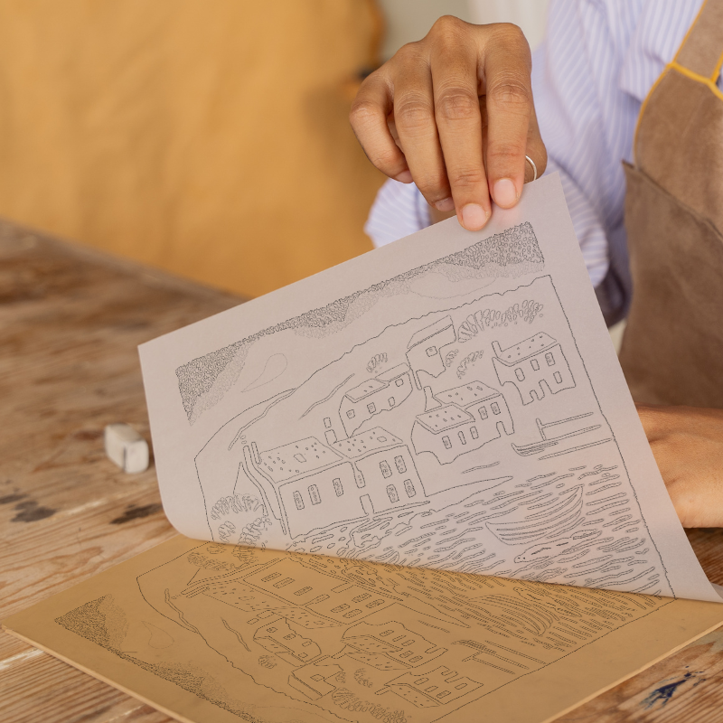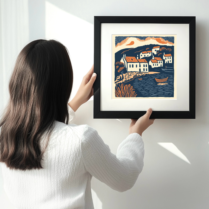 This stunning artwork captures the serene beauty of Coverack, Cornwall, in a distinctive lino-print style. Nestled in our UK Picturesque Harbours and Beaches collection, the piece highlights the quaint charm of this coastal village. The print showcases a series of charming white houses with terracotta roofs, intricately detailed against a backdrop of lush hills and calm waters. The harbour, portrayed in deep blue, mirrors the tranquil essence of the seaside. The sky, a blend of soft beige and vibrant orange, hints at a warm, serene atmosphere. The bold use of blue and orange not only brings the scene to life, but also adds warmth and depth, perfect for any room seeking a touch of coastal elegance. Available framed in black or white, and in two sizes, this piece will transform any space with its picturesque charm. For those wanting a personalised touch, the artwork is available for digital download, allowing for a lino-print creation at home.