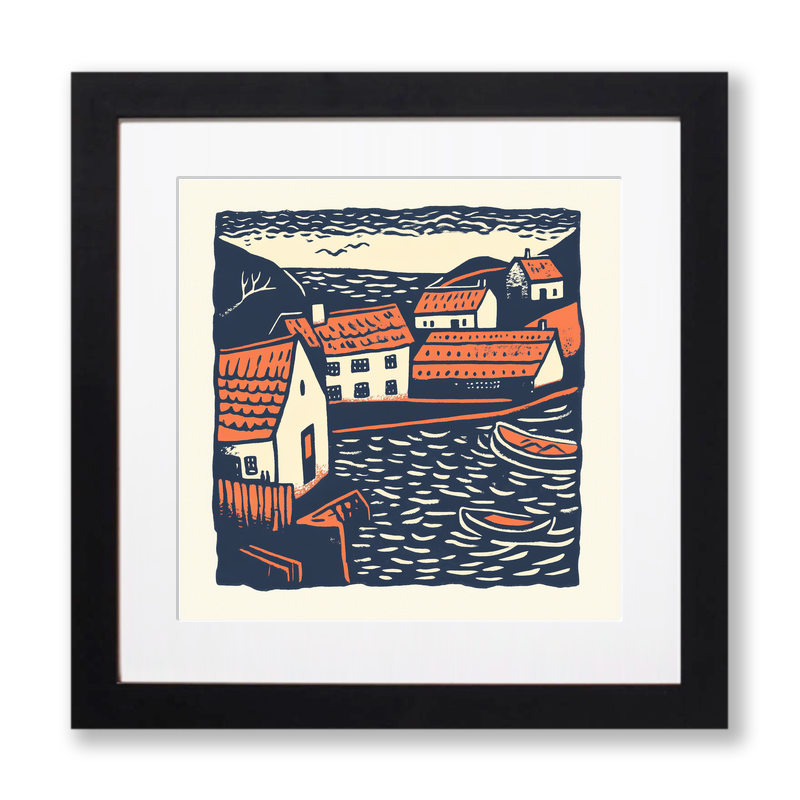 This striking lino-print style artwork captures the quaint beauty of Craster Harbour, Northumberland. Part of our 'UK Picturesque Harbours and Beaches' collection, the print showcases an idyllic coastal village with a charming array of whitewashed cottages and vibrant orange rooftops. The harbour is depicted with calm, rippling waters, featuring small boats gently floating by. Hills rise in the background, adding depth and serenity to this picturesque scene.
