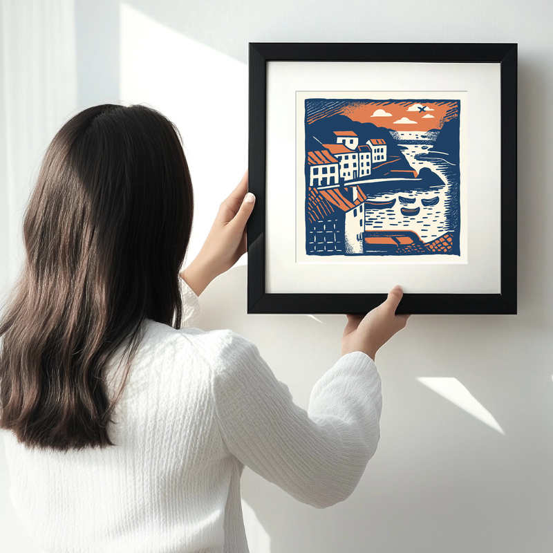 Bring the charm of Ilfracombe Harbour, Devon into your home with our exclusive lino-print style artwork from the UK Picturesque Harbours and Beaches collection. This piece beautifully captures the serene essence of a coastal town, with its quaint houses and gentle waterfront scene. Available in both 36cm and 46cm square sizes, our prints come elegantly framed in either black or white to suit your décor. Opt for a completed print or delve into creativity with our unique option to purchase and download the source images, line drawings, and sketches to craft your own lino print. Ideal for art enthusiasts and DIY lovers alike, this artwork not only adorns your walls but also offers an enriching artistic experience.