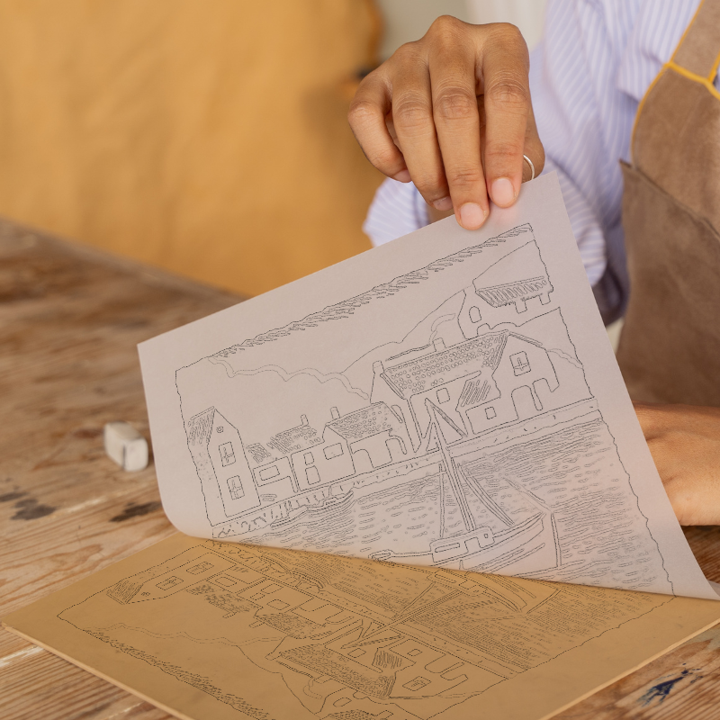 Immerse yourself in the charm of Looe Harbour with this distinctive lino-print style artwork, part of our UK Picturesque Harbours and Beaches collection. This piece captures the essence of coastal life in Cornwall, showcasing charming, rustic buildings with terracotta roofs that line the harbour's edge. A small boat, anchored and tranquil, gently sways on the deep blue waters, evoking a sense of serene seaside bliss. The surrounding landscape is depicted in muted tones, contrasting the clean lines of the cream-coloured buildings. The rich, earthy hues of terracotta and navy blue create a harmonious balance, complementing the scene's timeless appeal. Available in either black or white frames and in 36cm or 46cm square sizes, this artwork is perfect for bringing a touch of coastal tranquillity into any space. Enhance your creativity by purchasing our unique downloadable option, which includes the artwork's original line drawings and sketches, allowing you to create your own lino print inspired by this captivating scene.