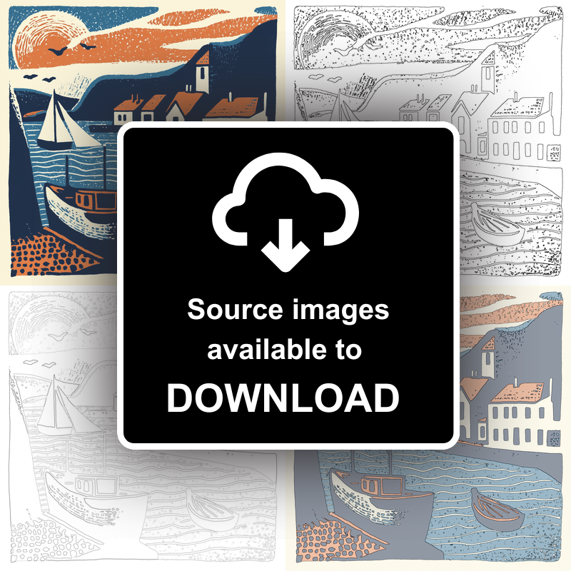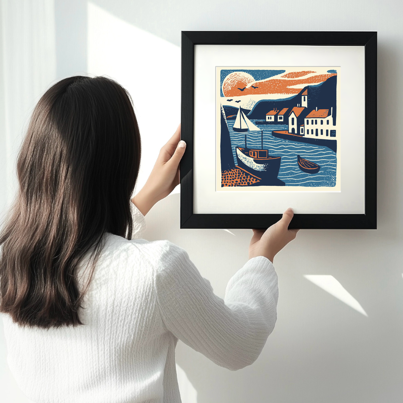 Capture the serene beauty of Looe Harbour, Cornwall with this exquisite lino-print style artwork. Part of our UK Picturesque Harbours and Beaches collection, this piece showcases a charming coastal scene. The image portrays the tranquil harbour with a sailboat gracefully navigating the waters and a quaint line of cottages overlooking the serene view. The rugged cliffs frame the horizon while seagulls soar under a captivating, textured sky. The colour palette is a harmonious blend of rich navy blue, vibrant terracotta, and soft cream, which evokes a nostalgic maritime vibe. Available in a 36cm or 46cm square frame in either black or white, this artwork is a timeless addition to any space. For the creatively inclined, opt to download the source images, including detailed line drawings and sketches, to craft your own unique lino print interpretation of this picturesque scene.