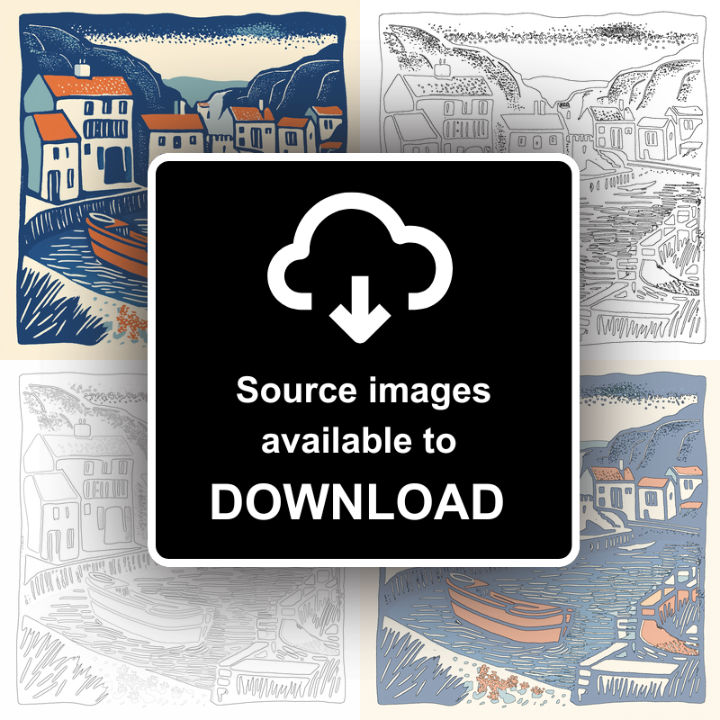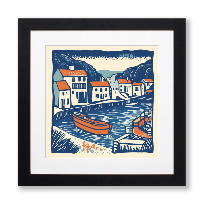 Immerse yourself in the serene charm of Polperro Harbour, captured beautifully in this vibrant lino-print artwork. This piece is part of our ‘UK Picturesque Harbours and Beaches’ collection, illustrating the quaint essence of this Cornish village. The artwork showcases a tranquil harbour with classic whitewashed buildings featuring orange-hued roofs nestled along the water’s edge. A solitary orange boat gently rests on the rippling blue waters, embodying the harmonious blend of man-made and natural elements. The surrounding hills cradle the village, painted in rich blues and greens, emphasizing the serene coastal landscape. Ideal for any lover of coastal scenery or Cornwall's unique beauty, this piece is available framed in either black or white, and in two sizes: 36cm or 46cm square. Additionally, enthusiasts can download the source images, including line drawings and sketches, to create their own lino prints, providing an engaging artistic experience. This artwork is more than just a print—it's an invitation to explore and express creativity.
