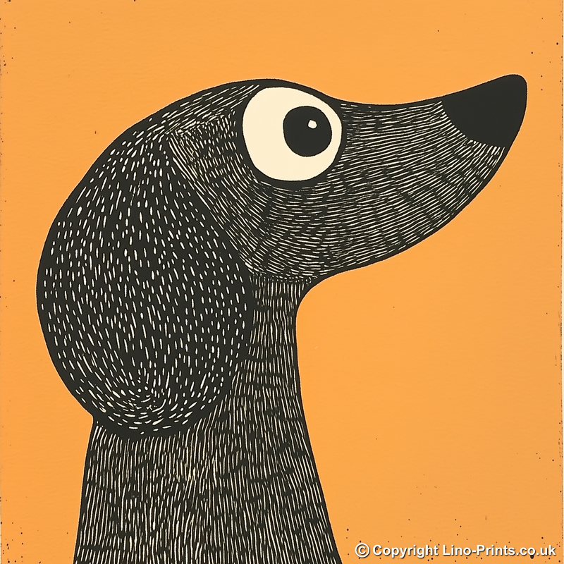 Enhance your home with a charming piece from our Dog Breeds collection—a delightful Beagle captured in a unique lino-print style. This artwork showcases the Beagle's iconic profile, drawn with intricate detail and a minimalist aesthetic. The striking contrast between the black and warm orange hues creates a captivating visual that draws the eye and evokes the joyful nature of these beloved dogs.