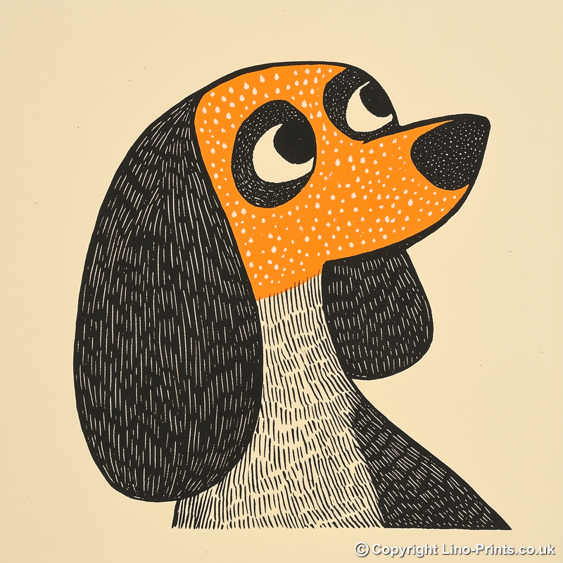 Explore the charming elegance of our Cavalier King Charles Spaniel lino-print artwork, a delightful addition to our exclusive Dog Breeds collection. This captivating piece captures the essence of the beloved breed with its expressive design, bringing joy to any space it adorns. Skillfully rendered in a distinctive lino-cut style, the artwork features bold, black contours that define the dog's gentle face and silky ears. A vibrant, warm orange graces the muzzle and eye area, exuding a sense of warmth and playful curiosity.