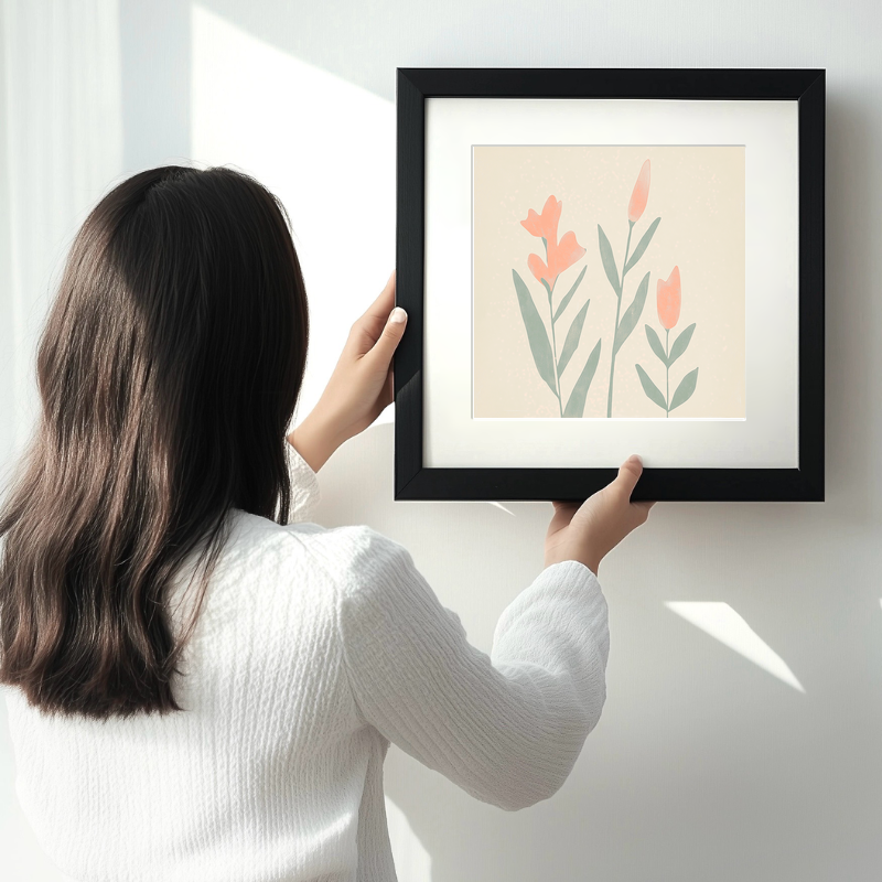 This exquisite lino-print style artwork beautifully captures the delicate elegance of gladiolus flowers. Part of our Floral & Botanical collection, the piece showcases three gladioli standing tall against a subtle cream background. The flowers are depicted in a gentle coral hue, exuding a sense of warmth and tranquillity. Each petal is carefully crafted to highlight the natural grace and fluidity associated with these blooms. The slender green stems and leaves add contrast, bringing a vivid touch of nature into the composition.
