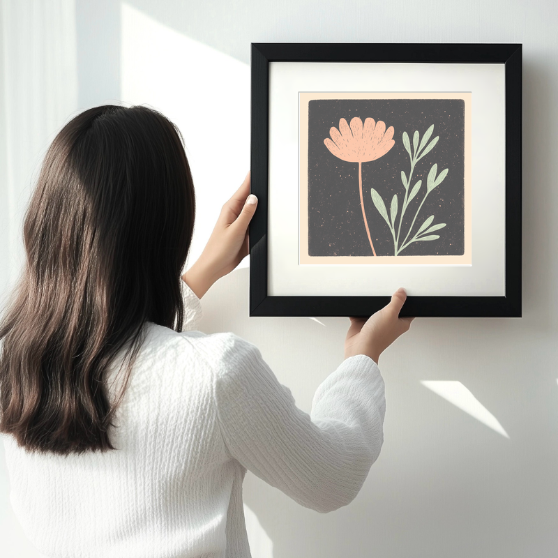 Immerse yourself in the delicate beauty of our 'Nigella (Love-in-a-Mist)' lino-print style artwork, a graceful addition to our Floral & Botanical collection. This stunning piece captures the ethereal charm of the Love-in-a-Mist flower, known for its intricate shape and alluring mystique. Rendered in a captivating minimalist style, the artwork features a solitary coral pink Nigella bloom, its petals softly etched to create a sense of depth and texture. Beside it, elegant green stems and leaves stretch upwards, their delicate veins adding a hint of realism to this enchanting botanical depiction.