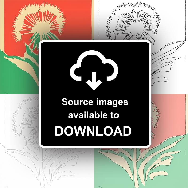 Introducing our captivating lino-print style artwork featuring a dandelion, a quintessential piece from our Floral & Botanical collection. This artwork beautifully captures the intricate details of a blooming dandelion in a strikingly minimalistic design. The dandelion, with its distinctively serrated petals, stands tall against a vivid background. The petals radiate from a central point, creating a sense of harmony and balance. The foreground is dominated by rich green leaves, their shapes carved out in a fascinating interplay with negative space.