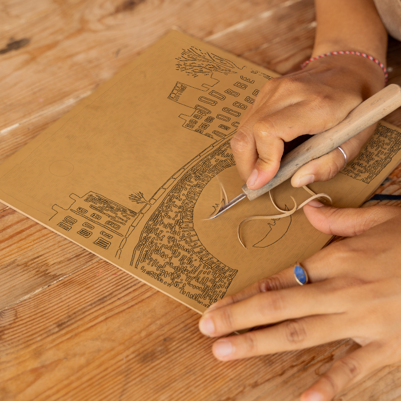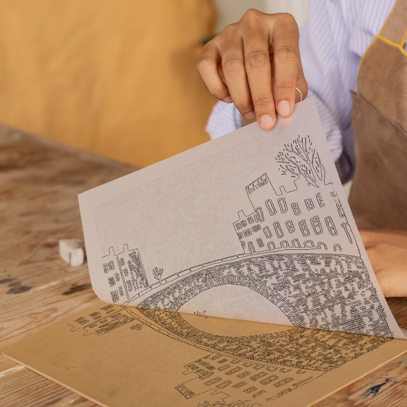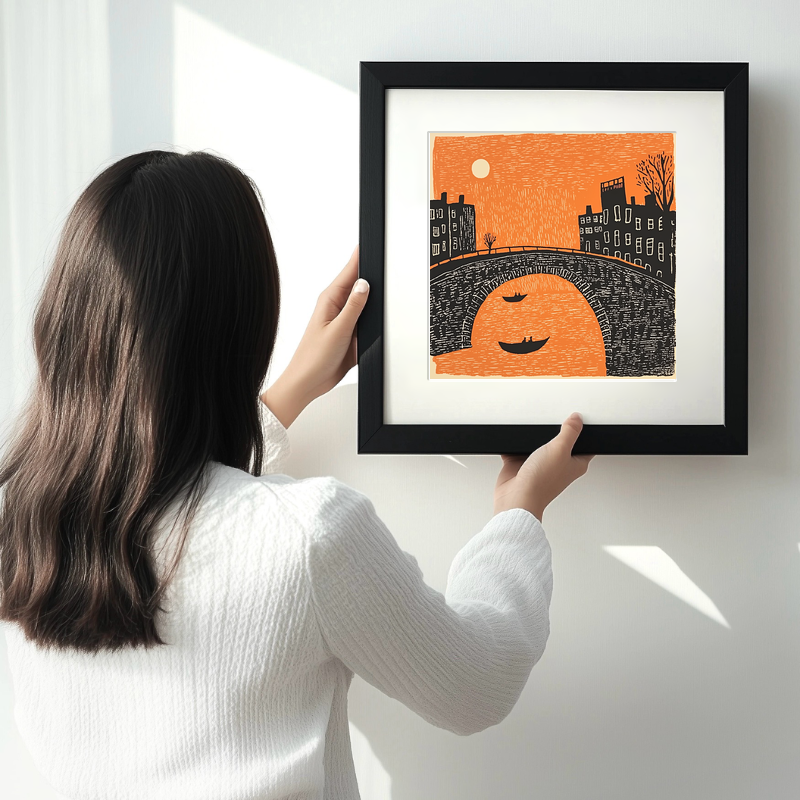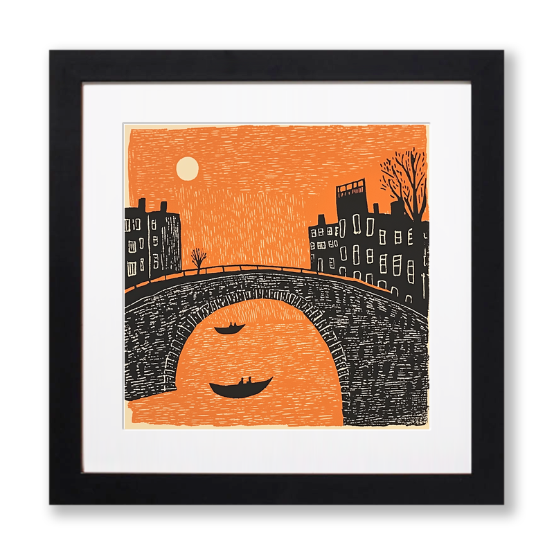 This captivating lino-print style artwork from our Architecture & Cityscapes collection offers a vivid depiction of a serene scene in Cambridge, showcasing two iconic elements: the historic bridges and elegant punts. The print captures the essence of a tranquil sunset, imbuing the scene with an orange hue that reflects elegantly on the water’s surface. The bold, black silhouettes of buildings and leafless trees frame the bridge, creating a striking contrast against the vibrant sky. The curvilinear lines of the bridge add a sense of depth and movement, while the solitary figures in the punts invite reflection and contemplation. Framed in your choice of black or white, this artwork brings a touch of classic British architecture into any space. In addition, the unique opportunity to download the source images and line drawings allows for personal creativity, encouraging you to craft your own interpretation of this picturesque scene.