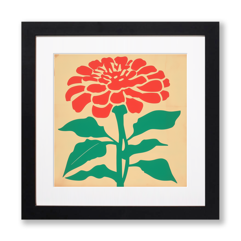 Embrace the vibrant elegance of nature with this stunning piece from our Floral & Botanical collection. The artwork showcases a striking Zinnia, rendered in a bold lino-print style that captures the intricate beauty of this beloved flower. Set against a soft beige background, the Zinnia's vivid red petals and lush green leaves come to life, offering a visual feast that radiates energy and life.
