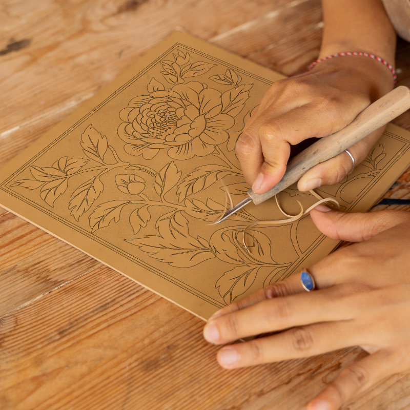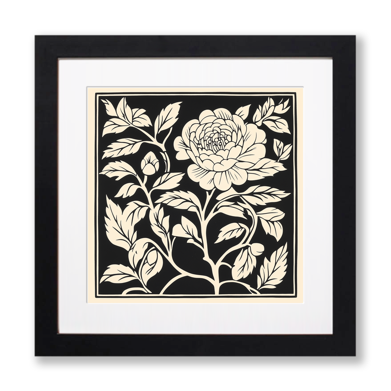 Elevate your living space with this exquisite Camellia lino-print style artwork, part of our Floral & Botanical collection. Captured with intricate detailing, this piece beautifully illustrates the delicate elegance of a Camellia flower. The artwork features a central blooming Camellia with its overlapping petals, accompanied by gracefully arching stems and lush leaves. Set against a deep black background, the creamy lines of the Camellia stand out, creating a striking contrast that adds depth and dimension to the piece. Perfectly framed in either black or white, this piece is available in two sizes: 36cm and 46cm square, making it a versatile addition to any room. Additionally, for those inspired by the art of lino printing, we offer a unique opportunity to download the source images, which include detailed line drawings and sketches. This allows you to bring the same beauty into your own lino print creations. Embrace the timeless beauty of the Camellia, perfect for both modern and traditional settings.