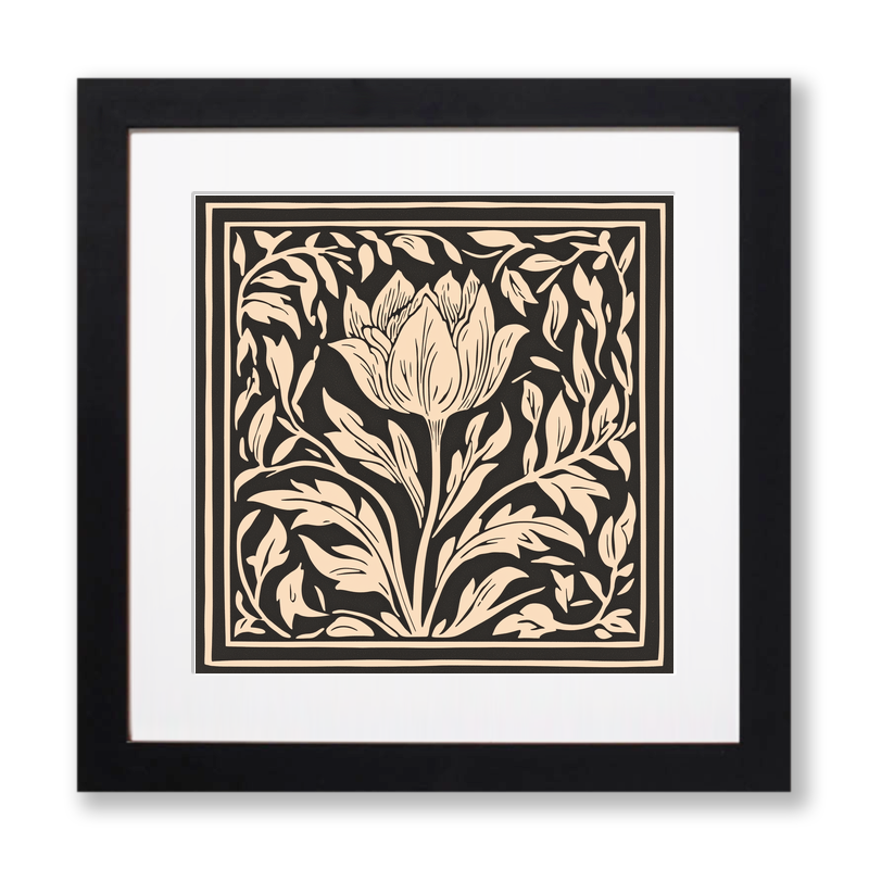 Introducing our stunning lino-print style artwork from the exclusive Floral & Botanical collection, featuring the delicate beauty of a tulip. This piece showcases the classic elegance of a blooming tulip, captured in intricate detail with a stylised black and beige design that pays homage to traditional lino cutting techniques. The central tulip flower stands gracefully, surrounded by flowing leaves and tendrils that frame the composition, all enclosed in a double-lined border that adds depth and sophistication. This artwork perfectly balances boldness and simplicity, making it an ideal addition to both contemporary and classic interiors.
