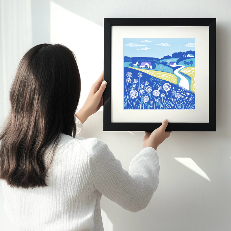 Experience the tranquil beauty of the English countryside with our exquisite lino-print style artwork, "Dandelions by Roadside Verge," from the Norfolk collection. This vibrant piece captures a serene rural vista, featuring gently rolling hills adorned with lush fields and quaint houses. The foreground is dominated by delicate, intricately detailed dandelions, their white puffball heads standing out against the rich blues and greens of the surrounding landscape. The sky is a calming shade of light blue, with soft white clouds drifting lazily above, offering a sense of endless peace and tranquillity.