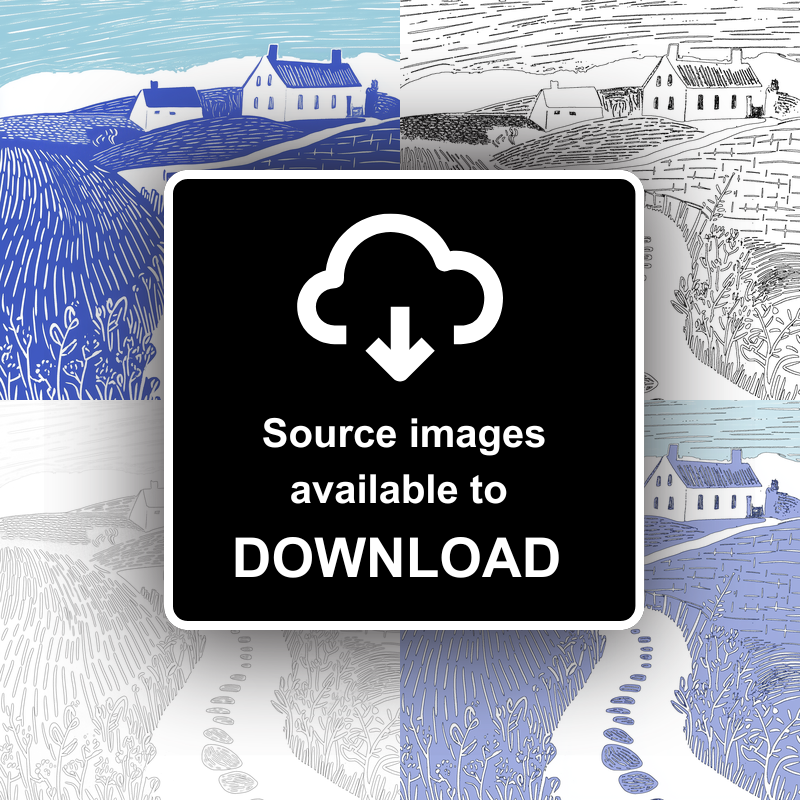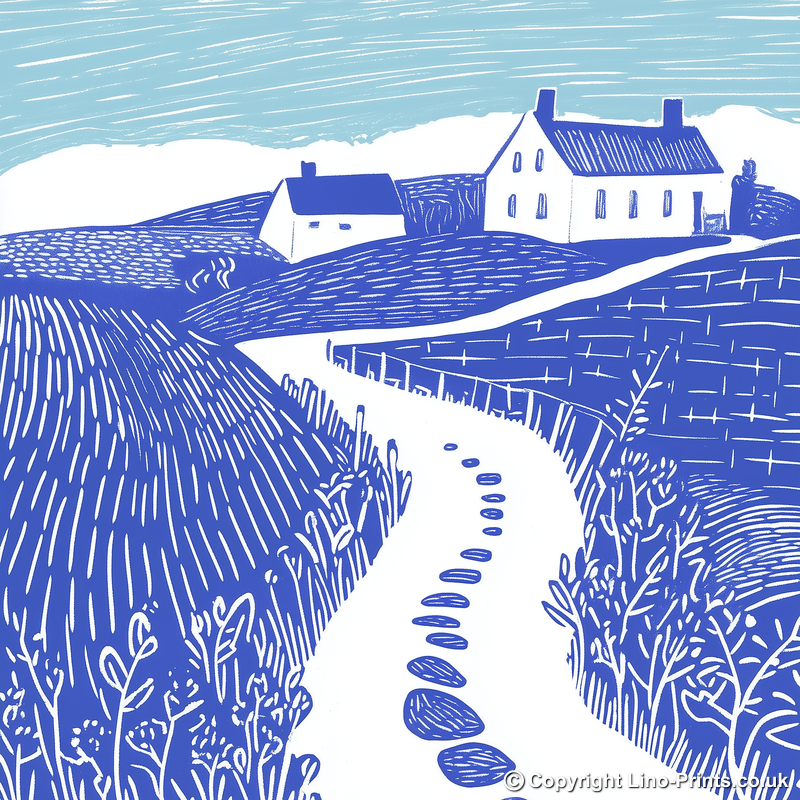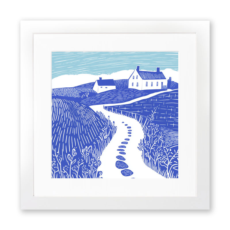 This striking lino-print style artwork, part of our Norfolk collection, captures the serene essence of a rural farm track adorned with glistening puddles after a fresh rain. The piece elegantly portrays a winding dirt path leading the viewer's eye towards a pair of quaint farmhouses nestled in the rolling hills. The foreground features delicate, intricate linework representing wild hedgerows bordering the track, artistically rendered in a rich cobalt blue. This contrasts beautifully with the lighter blue hues of the expansive sky that stretch across the top of the image, creating a sense of openness and tranquility. The composition is completed with textural cross-hatching across the fields, adding depth and movement to the landscape. Framed in your choice of black or white, and available in 36cm or 46cm squares, this print is not just a visual delight but also a perfect addition to any home decor. For the creatively inclined, the unique option of purchasing downloadable source images, including line drawings and sketches, allows you to craft your own lino prints at home.