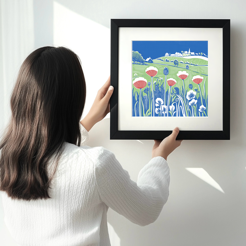 Immerse yourself in the tranquil beauty of rural Norfolk with our stunning lino-print style artwork, 'Field of Poppies near Snettisham'. Part of our exclusive Norfolk collection, this piece vividly captures the serene landscape with a field of tall, elegant poppies swaying gently in the breeze. Each flower is meticulously detailed, with blossoming red petals set against a background of lush green hues that depict rolling countryside. The vibrancy of the blue sky above adds a stunning contrast, complementing the detailed poppy stems and leaves.