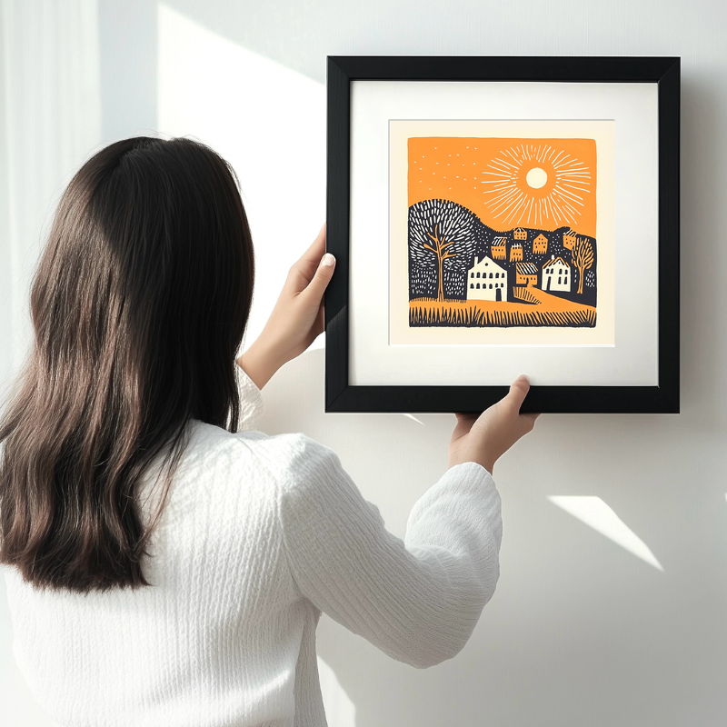Immerse yourself in the charm of Lisbon's historic Alfama district with this exquisite lino-print style artwork. Captured in a vivid blend of orange and contrasting black, the print presents a stylized interpretation of the district's iconic skyline, featuring classic Portuguese houses scattered amid rolling hills. The bold, swirling sun illuminates the scene, casting playful shadows and evoking the warmth of a timeless summer day. Fine lines and dynamic textures breathe life into the trees and grass, inviting you to wander through the detailed landscape. Available framed in sleek black or white, and two sizes—36cm or 46cm square—for the perfect fit in your space. For those with a creative spirit, we offer the unique opportunity to purchase downloadable images of this masterpiece, including line drawings and sketches to craft your own lino print. Whether displayed in your living room or studio, this piece from our Architecture & Cityscapes collection is a celebration of Lisbon's enduring beauty and artistic heritage.
