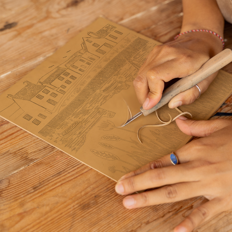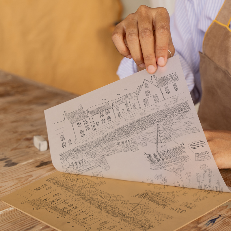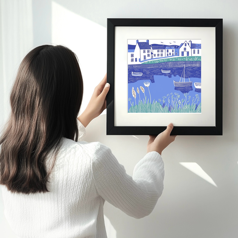 Capture the serene charm of coastal life with our exquisite piece, 'Reflections of Boats in Still Harbour.' This artwork is a masterful homage to the tranquil beauty of Norfolk's harbours, rendered in the distinctive style of lino-print art. The composition features a series of small boats gently bobbing in a calm, reflective harbour, their delicate itches and curves suggesting stillness and peace. Above the harbour, a quaint row of white houses in a picturesque townscape forms a striking backdrop, with seagulls gliding through a soft, open sky. In the foreground, graceful plants and reeds emerge, adding depth and texture to the scene. The dominant hues are calming blues, fresh greens, and crisp whites, creating a soothing visual experience. Available in either 36cm or 46cm square, framed in sleek black or classic white, this piece is perfect for bringing a touch of nautical elegance to any space. Additionally, you can purchase and download the source images, including detailed line drawings and sketches, to create your own lino print at home. Part of our unique Norfolk collection, this artwork is a must-have for those who cherish coastal beauty and artistic creativity.