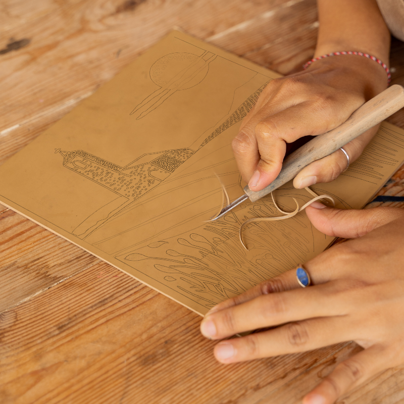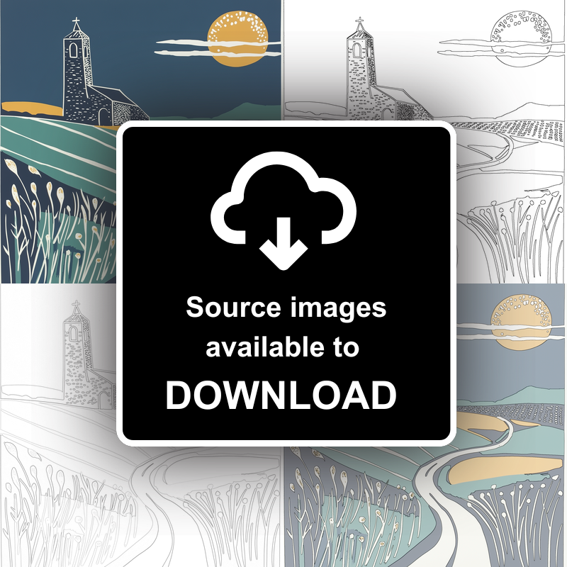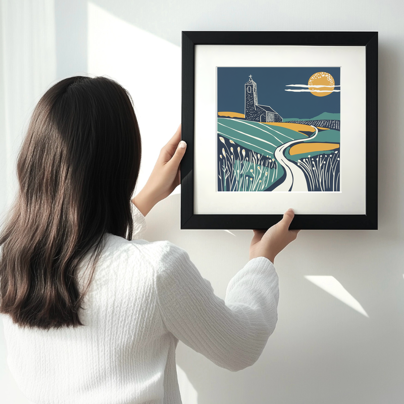 This striking lino-print style artwork features a solitary church tower rising majestically from the flat, expansive fields of Norfolk. The artwork captures the serene beauty of the rural landscape, highlighted under a richly hued blue sky adorned with a luminous, glowing moon. A winding path leads the eye past fields of golden crops and emerald grasses, invoking a sense of tranquility and timelessness. The tall, narrow structure of the church tower, with its simple lines and cross-topped spire, stands in stark contrast to the soft, rolling landscape that surrounds it. Delicate white plants and flowers border the fields, adding detail and texture to the foreground. Framed in your choice of black or white, this piece is available in two sizes, 36cm or 46cm square. Additionally, we offer a unique option to download the source images, including line drawings and sketches, for those inspired to create their own lino prints. Perfect for adding a piece of Norfolk's charm to any space, this artwork is both a striking visual statement and a celebration of England's rural heritage.