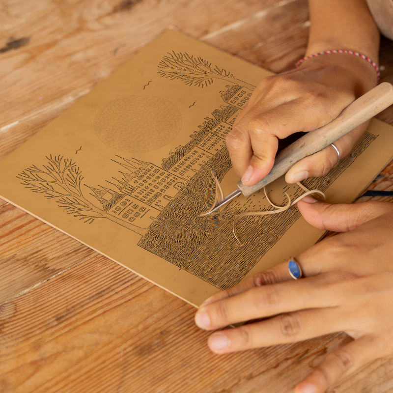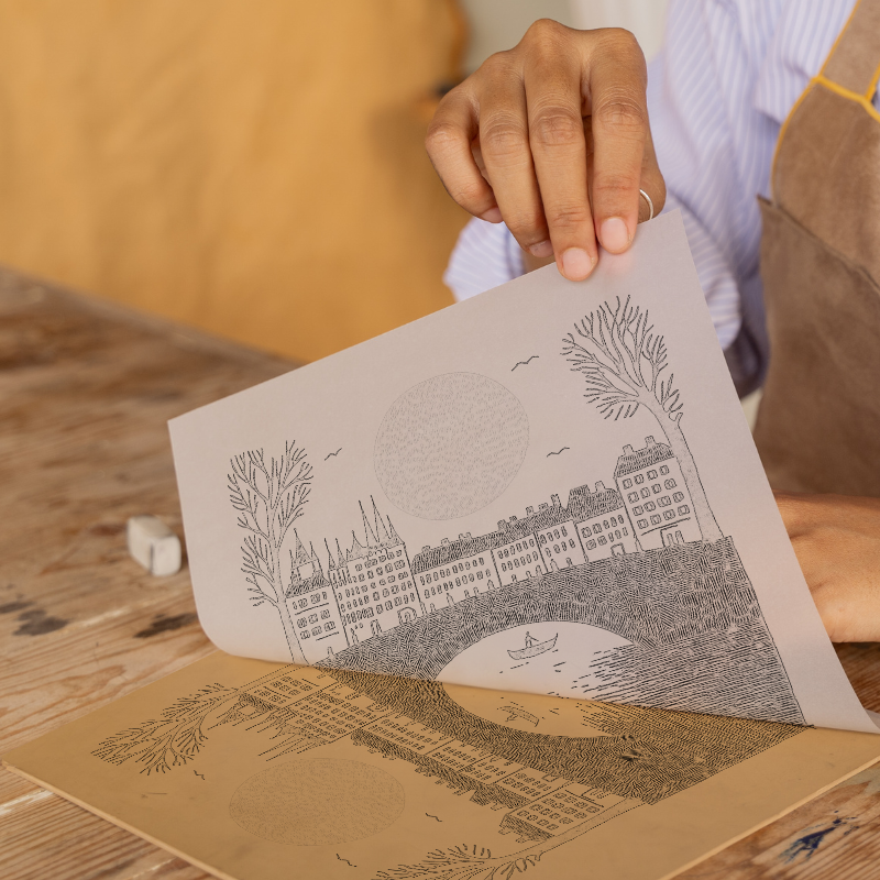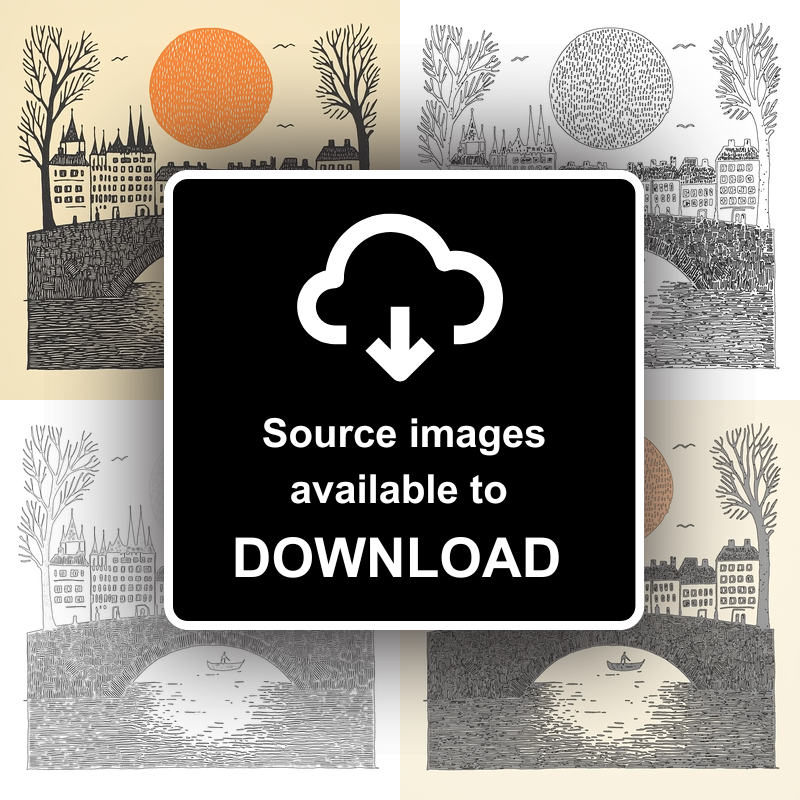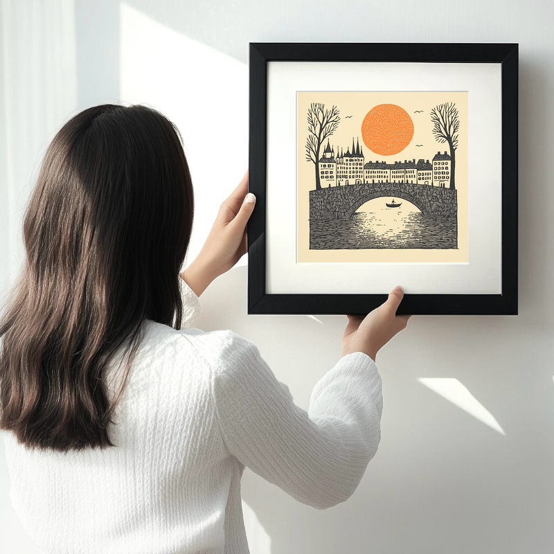 Experience the iconic beauty of Prague's Charles Bridge with this exquisite lino-print style artwork, part of our Architecture & Cityscapes collection. Capturing the essence of this historic landmark, the piece showcases the bridge's elegant arches and intricate details, framed by the city's charming skyline. The warm, burnt orange of the setting sun adds a striking contrast to the monochrome palette of the buildings and bare winter trees. This artwork evokes a sense of timelessness and tranquillity, perfect for any space. Available in two sizes, 36cm or 46cm square, framed in your choice of black or white. For those inspired to create, download the source images along with line drawings and sketches to craft your own stunning lino print.