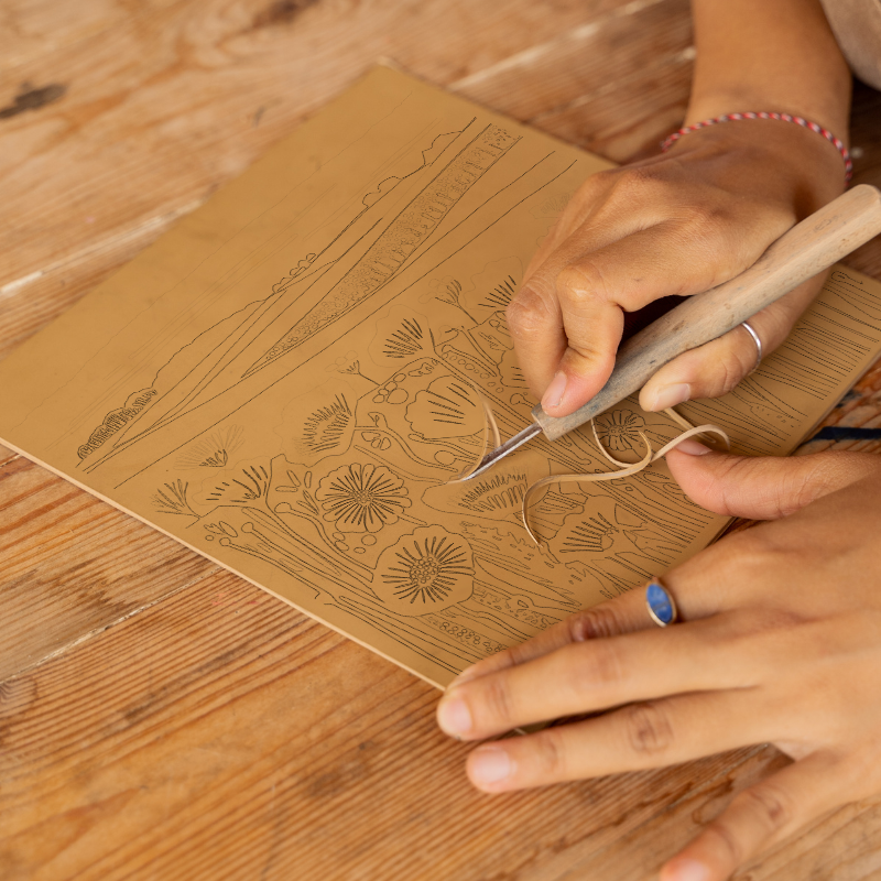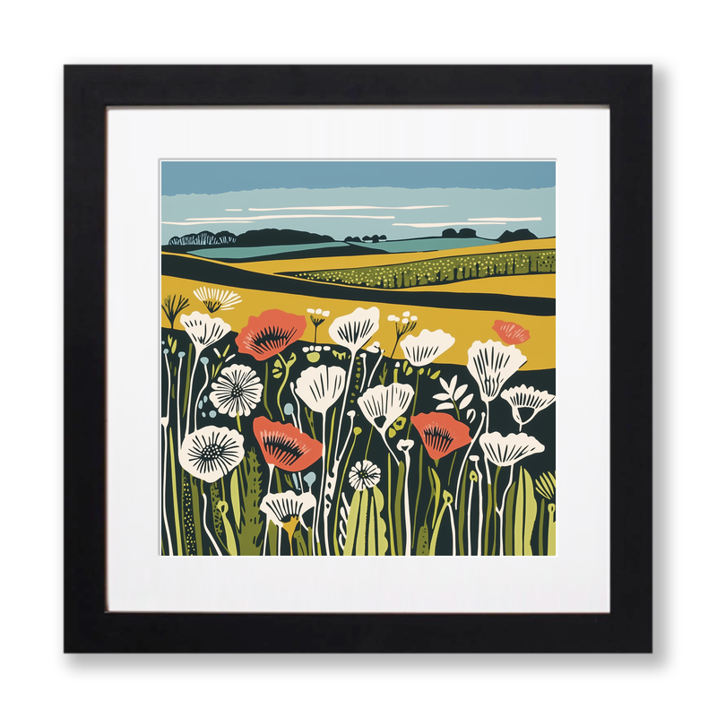 Available in striking square frames of either 36cm or 46cm in classic black or white, this piece is an ideal addition to any home or office decor, offering a touch of nature's calm and beauty. For those with a creative flair, we also offer the unique opportunity to purchase and download the original images, sketches, and line drawings, allowing you to produce your own lino prints at home. Dive into the art of print-making and bring this breathtaking landscape to life with your own hands.