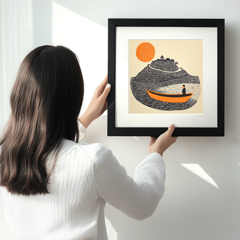 Explore the ethereal beauty of St Michael’s Mount with our captivating lino-print style artwork. Part of our esteemed Architecture & Cityscapes collection, this piece captures the serene and monumental elegance of Cornwall's iconic landmark. The artwork features a striking contrast of bold orange and classic black lines, depicting a tranquil scene where the island stands proud against a radiant sun. Each print, available in 36cm or 46cm square, comes elegantly framed in your choice of black or white, making it a perfect addition to any space.