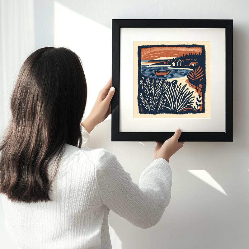 Delight in the tranquil beauty of the Norfolk coast with our 'Basket of Sea Lavender' lino-print style artwork. This piece captures the serene essence of a coastal landscape with its harmonious blend of rustic charm and natural beauty. Centered prominently in the foreground is a vivid representation of sea lavender, its intricate leaves beautifully rendered to evoke texture and movement. Beyond this, a gently bobbing boat graces the calm waters under a warm, dusky sky. The subtle separation between sea and sky is artfully achieved with a minimalistic gradient, evoking a sense of depth and vastness. A quaint village nestles alongside the shoreline, its charming houses rendered in simple, elegant lines that exude timeless character. The overall colour palette is a mix of rich, deep blues and warm terracotta tones, providing a comforting and inviting aesthetic that evokes the essence of a late summer afternoon by the sea. Available framed in either classic black or white and in sizes 36cm or 46cm square, this piece is perfect as a centrepiece for any room or as a thoughtful gift for art lovers. Alternatively, opt for our unique download option, allowing art enthusiasts to create their own lino-prints using the included line drawings and sketches, bringing a personal touch to this captivating scene. Enhance your art collection with this stunning portrayal of the Norfolk Coastline today.
