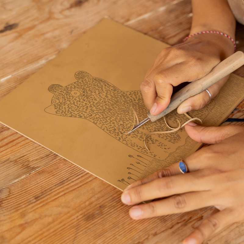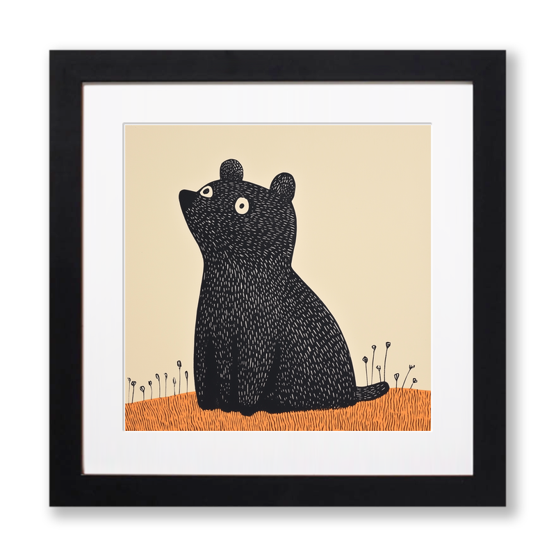 Bring a touch of whimsy to your space with our adorable 'Cute Bear Cub' artwork, part of the beloved Cute Animals collection. This captivating lino-print style piece features a charming bear cub, crafted in intricate black linework, set against a soft beige background. The bear cub gazes upwards with wide, innocent eyes, capturing the essence of youthful curiosity. Delicate patterns enhance the texture of its fur, adding depth and character to the artwork. The bear sits in a patch of warm, earthy orange, dappled with tiny, budding plants that lend an organic feel to the scene. Available in a sleek black or white frame, this print can be the perfect accent in any room. Choose our download option to receive the source images and line drawings, allowing you to create your own lino print! This piece is sure to delight animal lovers and art enthusiasts alike.