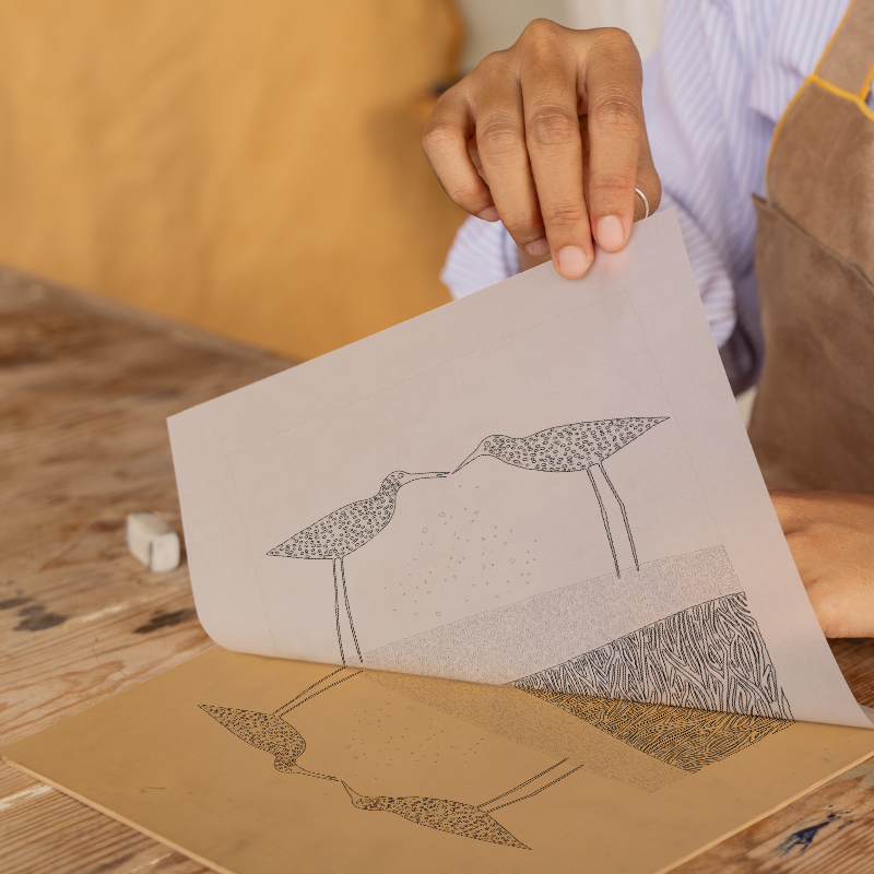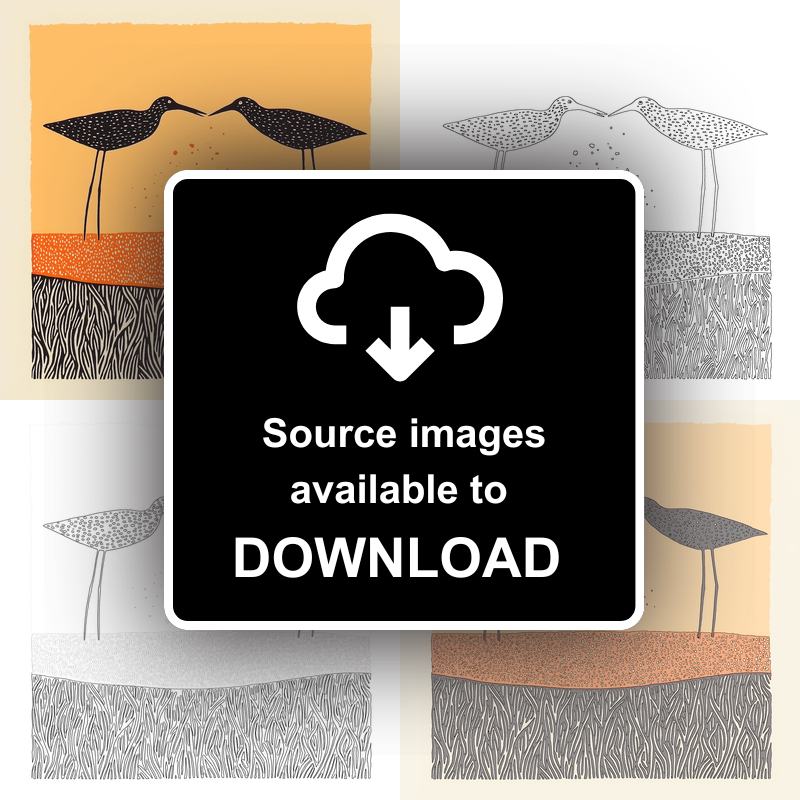 Introducing our exquisite lino-print style artwork featuring Redshanks feeding at the water's edge, part of the distinguished Norfolk collection. This striking piece captures the essence of tranquility and nature, showcasing two Redshanks in a mirrored pose perfectly symmetrically against a serene backdrop. The birds are elegantly depicted in silhouette form, with their elongated legs and beaks skillfully crafted in rich black that offers a stunning contrast to the warm hues of the setting.
