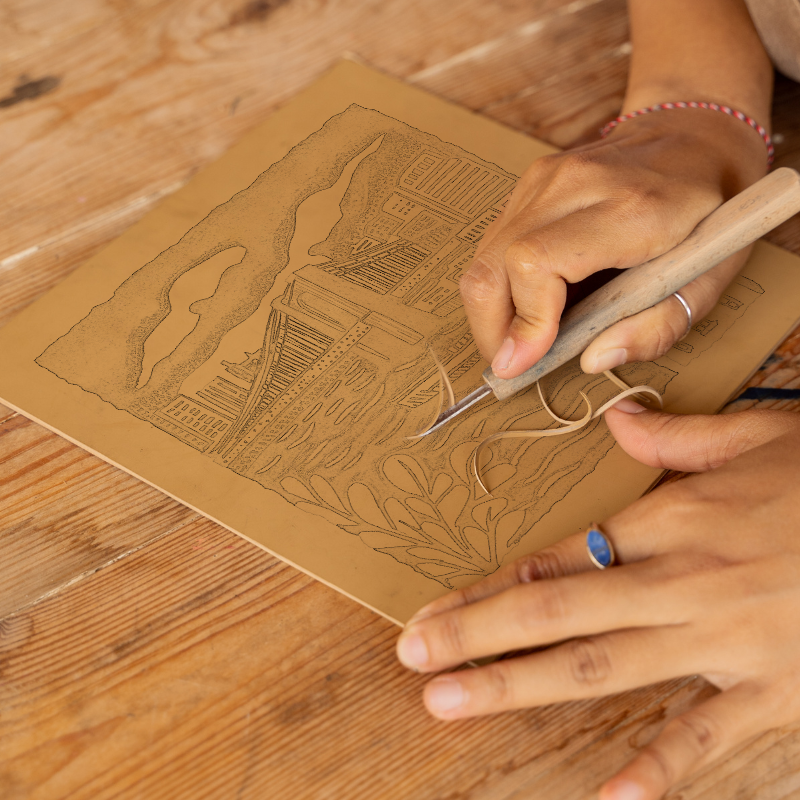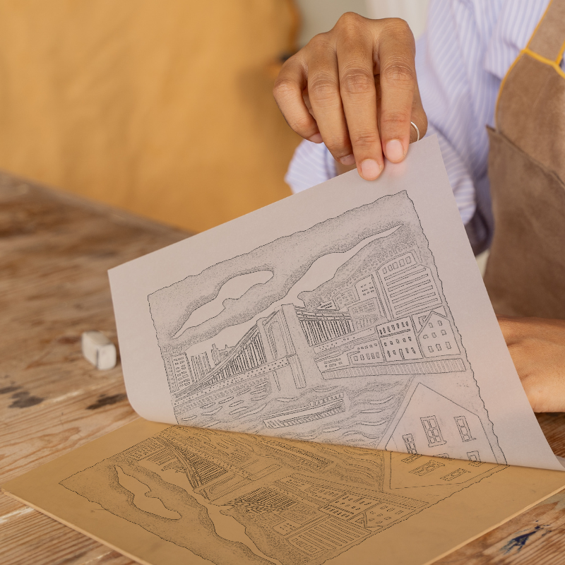 Capture the vibrant essence of the iconic Brooklyn Bridge with this striking lino-print style artwork. Rendered in bold hues of deep navy, striking orange, and creamy beige, this piece depicts the architectural marvel in a dynamic cityscape setting. A sweeping view of the bridge arches gracefully across the canvas, with its intricate cables paying homage to the engineering feats of New York's past. In the foreground, a classic boat rides the stylized waves of the East River, framed by the angular outlines of towering skyscrapers that form the skyline. A hint of nature is introduced with stylized leaves, reflecting the harmonious blend of urban life and natural beauty. Available framed in sleek black or white, this artwork is perfect for those who appreciate the charm of metropolitan landscapes. Whether hung prominently in a living room or study, this piece will transport viewers to the bustling energy of New York City. Enhance your space with this beautiful blend of art and architecture, or opt for our downloadable version to embark on your own creative journey.