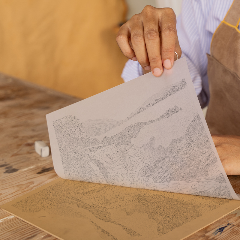 Celebrate the serene beauty of the Lake District with this captivating lino-print style artwork of Aira Force waterfall. The print exquisitely captures the tranquil yet powerful essence of the waterfall as it cascades gracefully over rugged rocks, surrounded by densely textured foliage and gently rolling hills. The composition features flowing, hand-drawn lines that give the scene a sense of movement and depth, with the waterfall at the heart of the image glimmering in gentle whites and creams. The surrounding landscape is brought to life in soft muted greens, earthy yellows, and slate blues, evoking a sense of calm and connection to nature. The countryside elements—bushes, distant hills, grasses, and stones—are rendered in a distinctive, intricate style, reminiscent of traditional lino printing, making this print a stunning centrepiece for any space. Available framed in sleek black or contemporary white, and in two sizes (36cm or 46cm square), this print is a part of our exclusive Lake District collection. For those inspired by creativity, we offer a special option to purchase and download the original source images, including the line drawings and sketches—perfect for anyone who wishes to try their hand at creating a bespoke lino print at home. Bring the spirit of the Lake District into your living space with a timeless piece that marries traditional artistry with a modern twist.