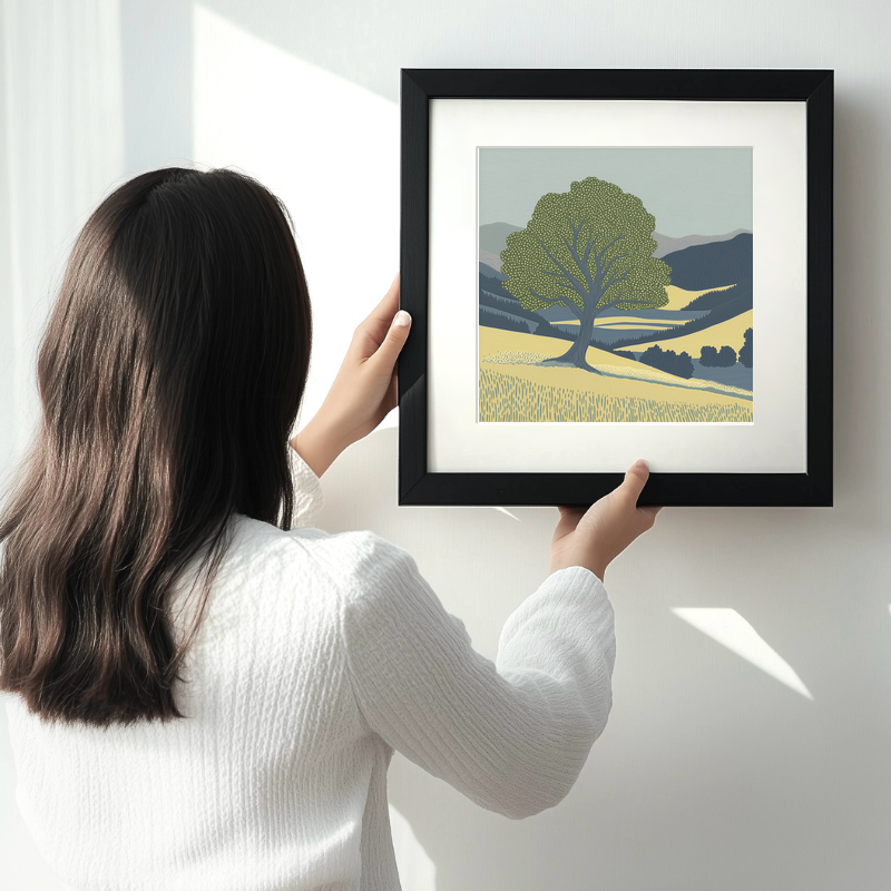Celebrate the timeless beauty of the Lake District with this striking lino-print style artwork featuring an ancient oak tree nestled in a serene valley. Rendered in the distinctive style of linocut, each intricate line brings texture and depth to the landscape, with careful curves and flowing marks capturing the strength and elegance of the oak. The tree, with its robust, spreading trunk and delicately detailed canopy, stands as a symbol of endurance, framed against rolling golden fields and a backdrop of sweeping dark blue hills. Gentle gradients suggest the softness of the distant landscape, while the foreground is alive with finely drawn grass blades swaying in the light. Subtle green, muted blues, and soft yellows create a peaceful yet dynamic scene, ideal for both modern and traditional interiors. Available in either a black or white frame, and in two square sizes (36cm or 46cm), this print brings the tranquil spirit of the Lake District right into your home. For those who enjoy hands-on creativity, you can also purchase a digital download of the original source materials, including the line drawings and sketches — perfect for crafting your own lino print inspired by this unique piece.