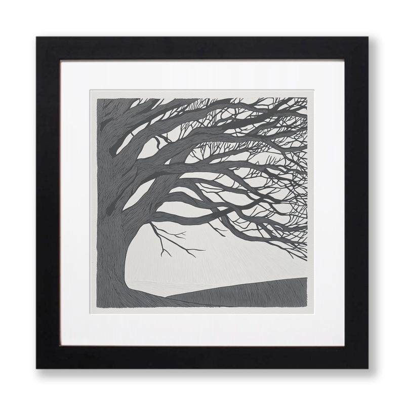 Capture the stark beauty of winter in the Lake District with this striking lino-print style artwork, featuring the intricate silhouette of bare tree branches set against a serene landscape. Every detail of this piece celebrates the artistry of negative space and line work. The gnarled, arching trunk and gracefully tangled branches stretch across a softly textured background, evoking a sense of calm and quiet, perfectly reminiscent of a crisp winter’s day in the countryside. Meticulously hand-drawn in a traditional linocut style, this artwork brings together rich, inky blacks with gentle shades of grey, achieving both simplicity and depth in one timeless image. Ideal for those who appreciate nature-inspired decor, each print is available professionally framed in your choice of black or white, and in two versatile square sizes (36cm or 46cm), ready to hang and enhance any room. For creative souls, we also offer a unique digital download bundle comprising the source image, line drawings, and original sketches, so you can craft your own lino print at home. Whether as a gift or a statement piece, this artwork is a celebration of the quiet drama of the Lake District in winter.